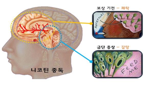 담배 내 많은 유해 성분 중, 흡연자 의지에 상관없이 수시로 담배를 찾게 되는 ‘중독’에 관여하는 물질이 바로 ‘니코틴’이다. 흡연 시 뇌 특정 부위에 도달한 니코틴은 그것을 받아들이는 ‘니코틴 수용체’와 결합하고, 그 결합으로 수용체가 활성화되면서 마음을 안정시키고 기분을 좋게 만들어주는 ‘도파민’이라는 물질이 분비(보상 기전)된다.
