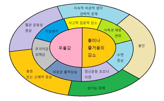 흔히들 잘 알려져 있는 식욕, 수면리듬의 변화, 초조한 기분, 활력의 상실, 무가치감 또는 죄책감, 죽고 싶은 마음, 사고력과 집중력의 감소뿐만 아니라 불안감, 만성통증, 성기능이나 욕구 장애, 혈관운동성 문제, 여러 가지 신체질환에 대한 민감성, 강박적 문제와 같은 부분들이 중복하여 나타날 수 있습니다.