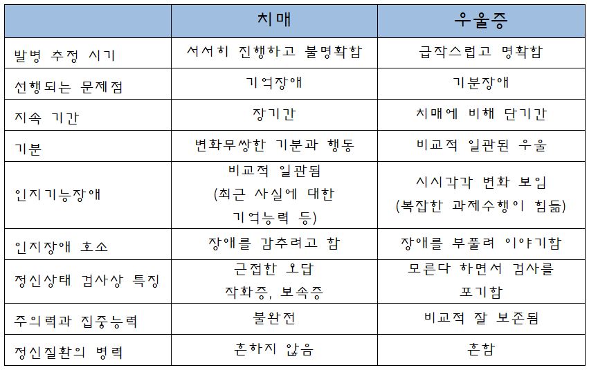 저희 정신건강의학과 의사들도 중년이나 노년층에서 인지기능 장애가 있다며 내원한 경우 이 것이 진짜 기질적인 문제에 의한 치매와 같은 인지기능 장애냐? 아니면 우울증에 의해 나타난 인지기능 저하 또는 가성 치매냐? 아니면 두 가지의 문제를 동시에 가지고 있느냐?를 감별하기 위한 노력을 많이 합니다.