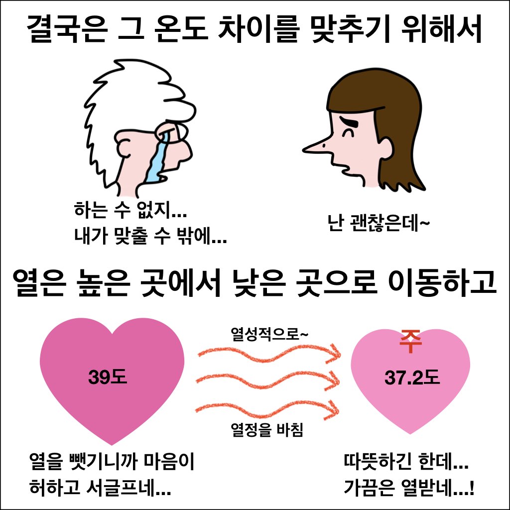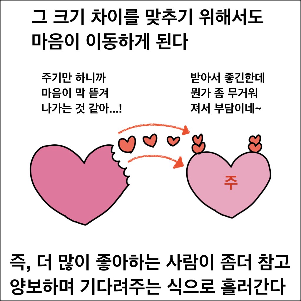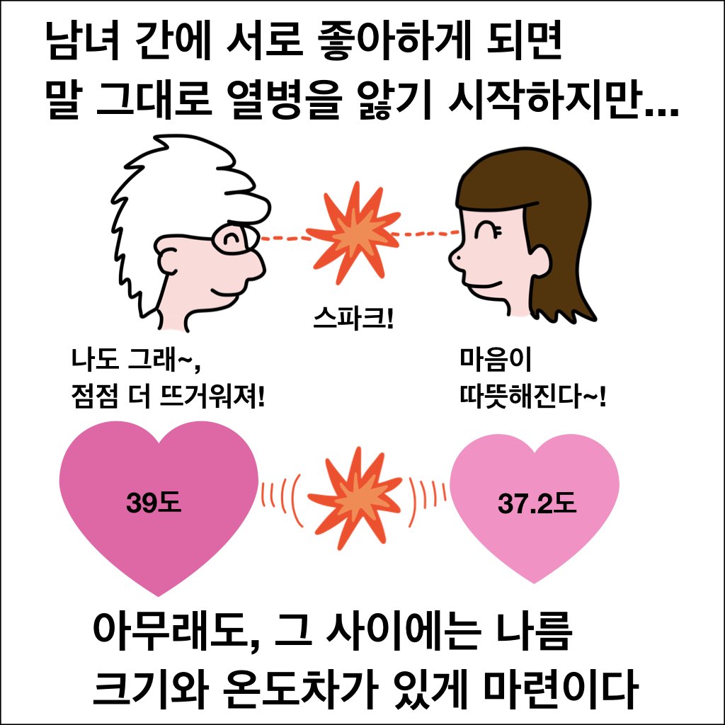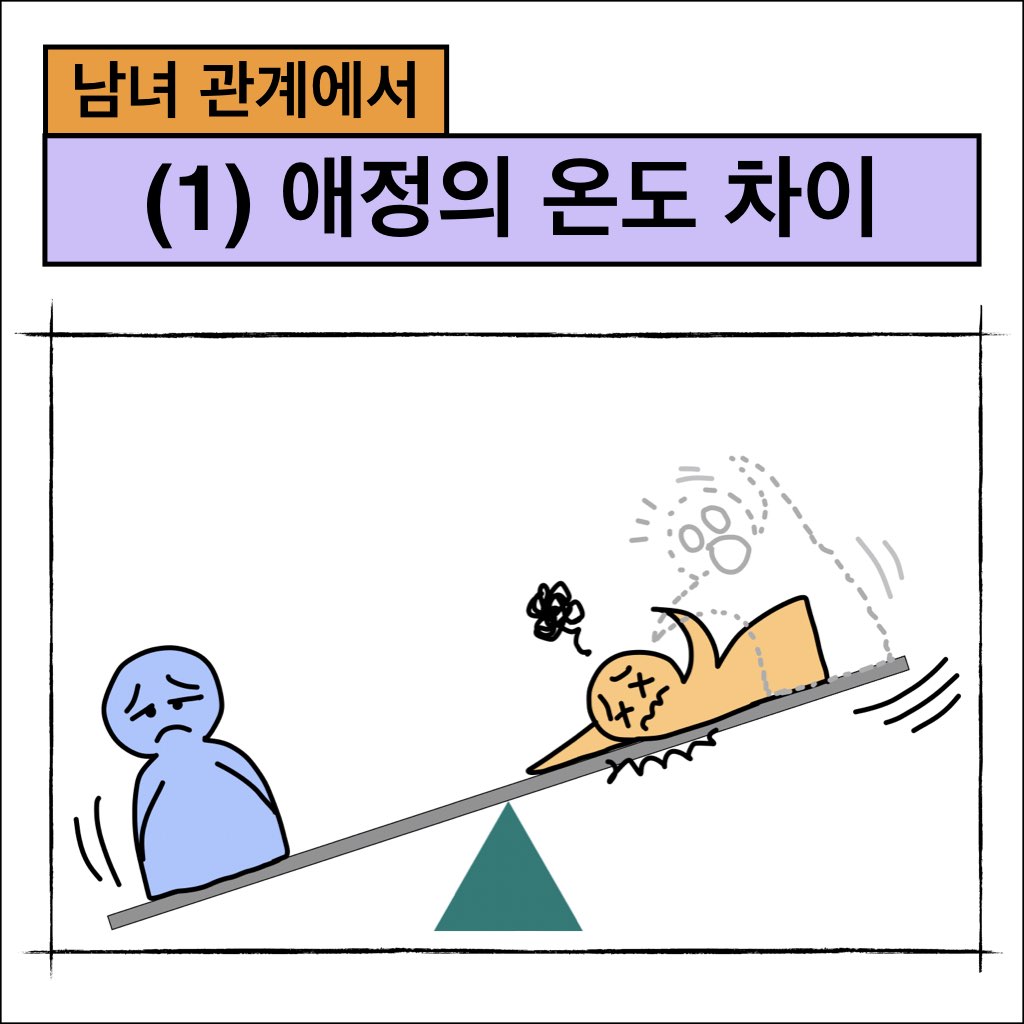 임상에서 많은 남녀들과 상담할 때마다 항상 드는 몇 가지 의문점이 있었다. 그중 하나가, '왜 둘 중 한 사람이 실제로 상대방을 진심으로 좋아해서 잘 맞춰주는데도, 그 사람은 물론이거니와 그 상대방조차 만족하지 못할까?' 하는 것이었다. 거기엔 물론 많은 이유가 있겠지만, 그중 애정의 온도차로 한번 바라보는 것도 좋을 것 같아서 이렇게 그려보았다.