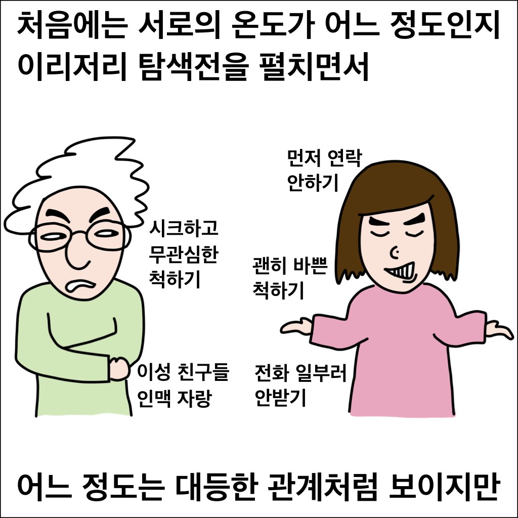 남녀 간에는 더 좋아하는 사람이 손해이고, 소위 지는 게임인가? 더 희생해야 하고 맞춰주어야 하니까? 그럼, 맞춰주기만 한다면 좋은 관계가 될까? 혹은, 밀당의 고수는 과연 사랑을 정말로 잘 알고, 또 잘하는 사람일까? 아무리 생각해봐도 이성적 논리나 승부의 개념으로 사랑을 이해하기는 어렵다. 결국, 애정의 온도차가 크지 않아, 일방적이 아닌 서로의 적정온도를 향해 오랜 시간 서서히 조절하는 그런 쌍방의 노력이 필요해 보인다.