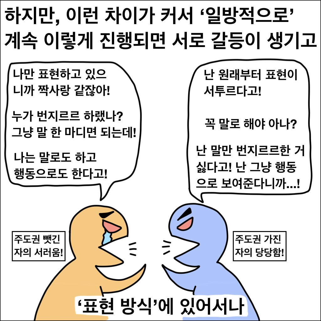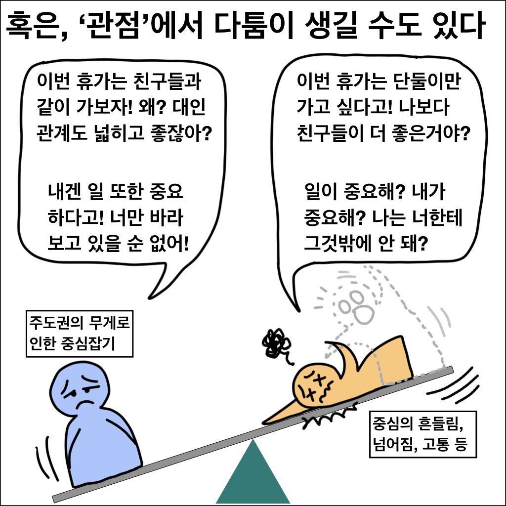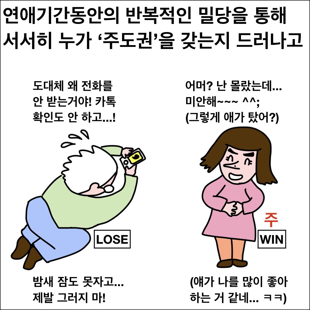 남녀관계에서 한치의 오차도 없이 똑같이 50대 50인 그런 대등한 관계가 있을까? 정말 쉽지 않다. 아니, 거의 불가능하다. 남녀 간의 애정에서도 어쩔 수 없이 상대적 강자와 약자가 존재하고 실제로는 약하기 때문에 강자인 척하는 경우도 많기 때문에 강자/약자보다는, 두 사람 사이에서 좀 더 주도권을 갖는다는 느낌이 더 어울릴 것이다.