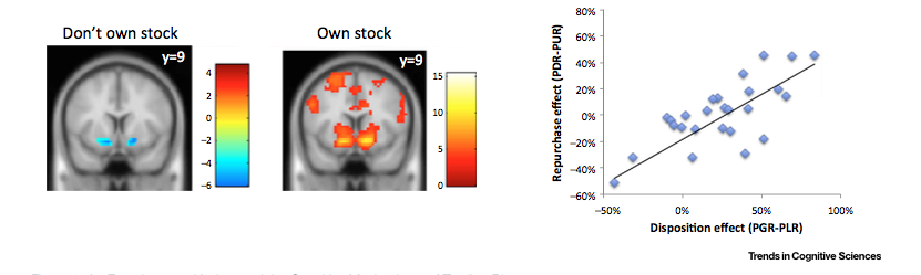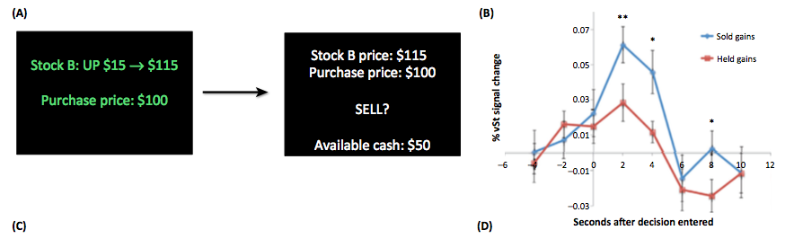 위 그림은 참자가가 주식 가격 변동에 따른 의사결정을 한 뒤에 배쪽 선조체(Ventral striatum) 활성도의 변화를 기록한 것인데, 가격이 오른 자산을 매도할 때에는 배쪽 선조체의 활성이 증가하였으나(파란색), 가격이 상승한 자산을 보유할 때에는 증가하지 않았다(붉은색).