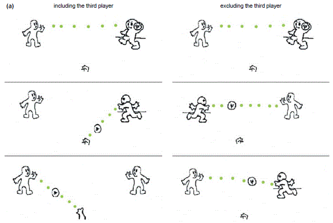 캘리포니아 대학 연구 팀의 아이젠버그와 리버만은 조직 사회에서의 소외감이 뇌에 미치는 영향을 연구하기 위해 ‘사이버볼’이라는 컴퓨터 게임을 만들었습니다. 이 컴퓨터 게임에서는 실험 참가자를 포함한 세 명의 플레이어가 공을 주고받습니다. 세 명 중 참가자를 제외한 나머지는 사실 컴퓨터 프로그램이지만 실험 참가자에게는 나머지 두 명의 플레이어를 인간이라고 알려줍니다. 그리고 시간이 지남에 따라 나머지 두 명의 플레이어(이지만 사실은 미리 프로그램된 컴퓨터 플레이어)는 실험 참가자를 빼놓고 둘이서만 공을 주고받습니다. 그리고 기능적 자기공명영상을 통해 해당 상황에서의 뇌의 활성도를 측정하고, 또한 고통의 정도에 대해서 보고하도록 지시하였습니다.