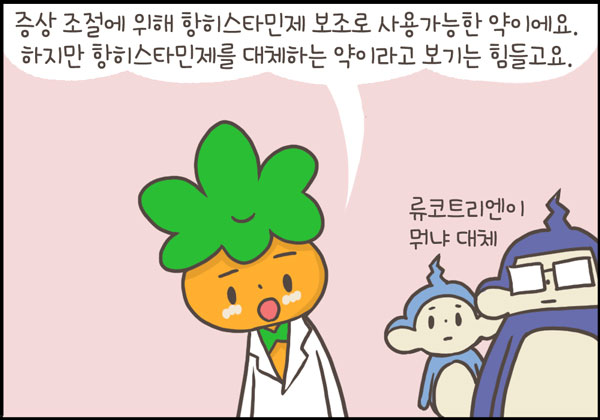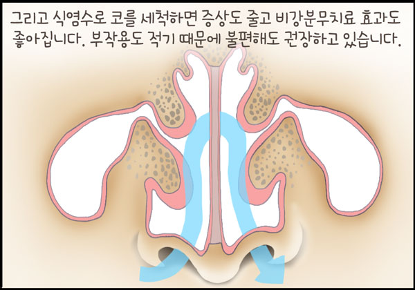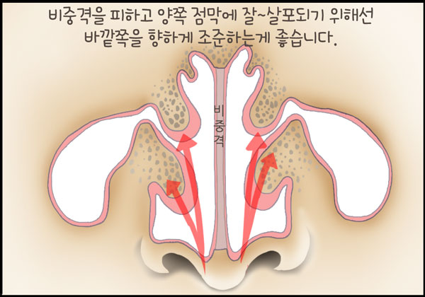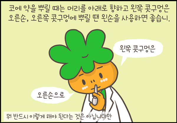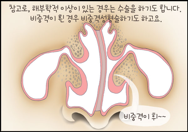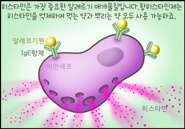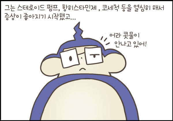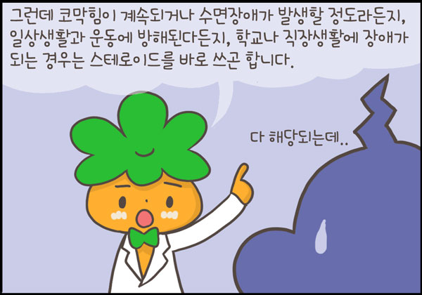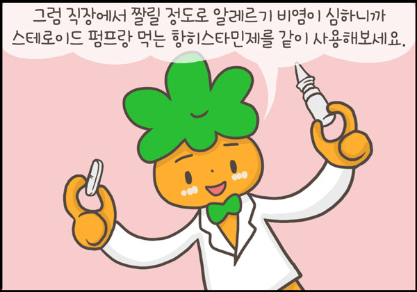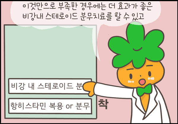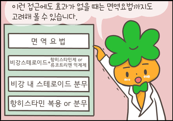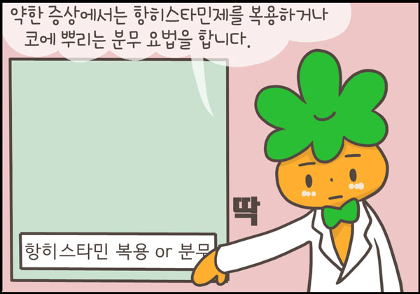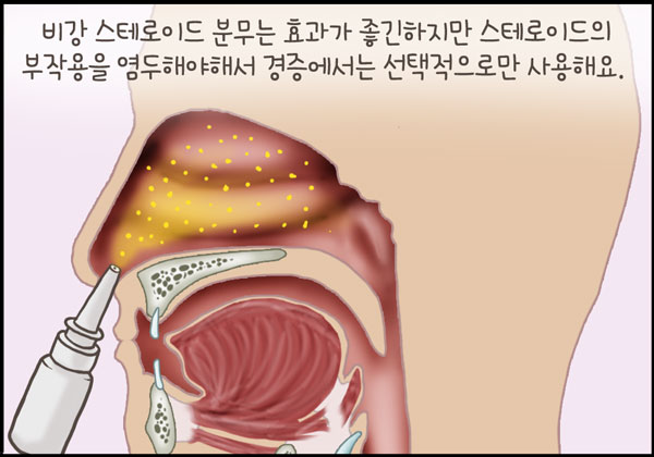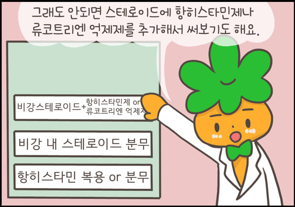 약한증상에는 항히스타민제를 복용하거나 코에 뿌리는 분무요법을 시도합니다. 항히스타민제는 알레르기 면역반응의 가장 중요한 매개체인 히스타민을 억제하는 약으로 알레르기의 치료에 가장 중요한 약물입니다. 그 다음 단계에서 쓸 수 있는 약은 스테로이드 분무치료입니다. 스테로이드는 면역염증반응을 억제하는 효과가 있지만 먹는 약으로 사용했을 때는 과다 사용시 쿠싱 증후군 등의 부작용이 발생할 수 있기 때문에 코에 뿌리는 약으로 사용합니다. 여기서 한 단계 더 높이면 비강 스테로이드와 항히스타민제 또는 류코트리엔 억제제라는 염증반응을 억제하는 약을 써볼 수 있습니다.