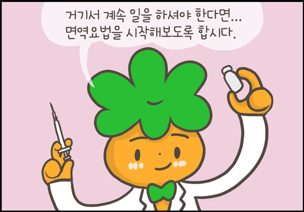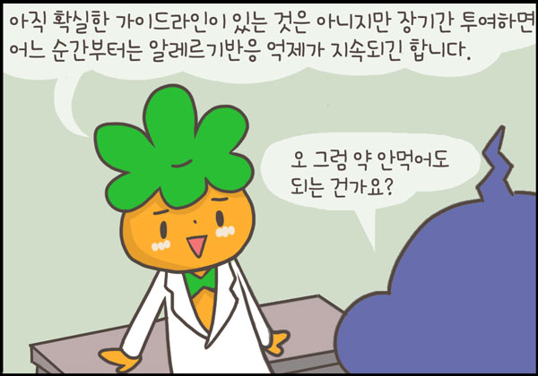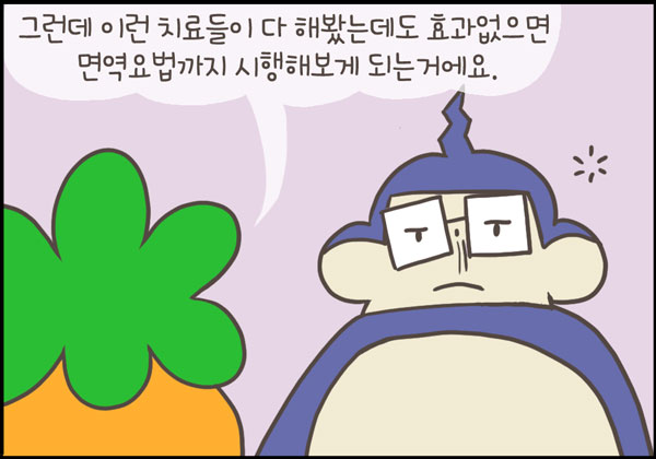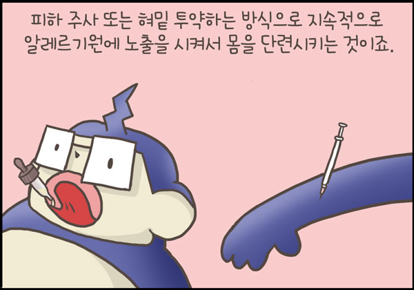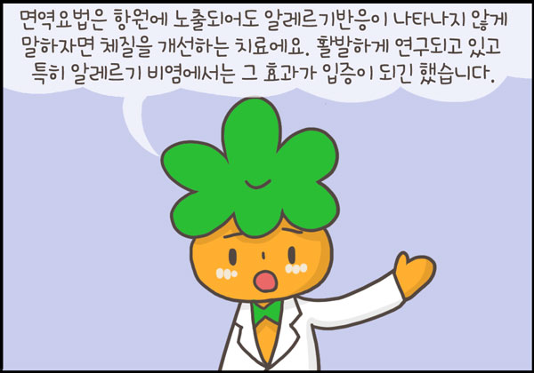이런 시도에도 불구하고 증상이 조절되지 않는다면 면역요법을 시도할 수 있습니다. 면역요법은 알레르기원을 약하지만 지속적으로 환자에게 노출시킴으로써 알레르기반응이 둔화되게 만드는 방식으로 수 개월에서 수 년의 기간을 두고 하게 됩니다. 알레르기 중 특히 알레르기 비염에서 효과가 좋은 것으로 연구되었는데 알레르기원 노출이 장기간 없어지면 다시 알레르기 반응이 나타날 수 있습니다.