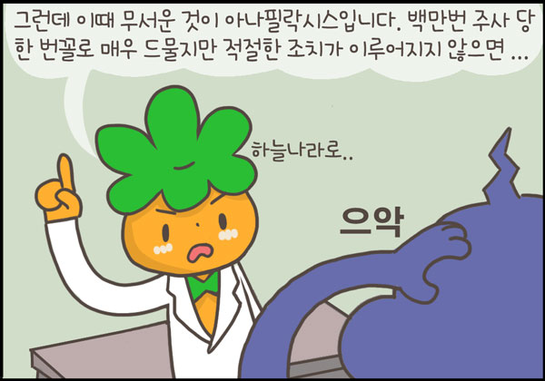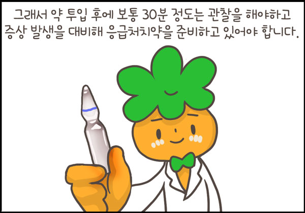 주의할 점은 알레르기반응을 일으키면서 나타날 수 있는 아나필락시스반응으로 백만 번 주사 당 한 번 정도로 드물긴 하지만 생명에 위협이 될 수 있기 때문에 적절한 대비를 하고 시행하는 것이 중요합니다.