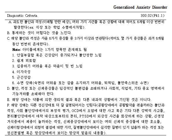 이렇게 다양한, 아니 거의 모든 부분에서 과도한 불안과 걱정을 느끼는 사람은 범불안장애를 의심해 봐야 한다.