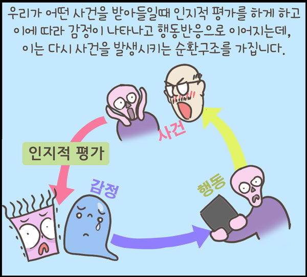 답부터 말하자면, 우리는 우리의 생각을 알아차리기 위해, 먼저 우리의 감정을 알아야 한다. 감정은 생각보다 우리 마음속에 조금 더 오래 머문다. 때문에 빨리 지나쳐버리는 생각보다 감정을 알기가 조금 더 쉽다. 인지치료의 내용을 조금 빌려보자. 어떤 상황에 마주하게 되면 사람은 그에 따른 생각을 하고 생각에 따른 감정을 느끼고, 생각과 감정에 따른 행동을 한다. 우리는 이 감정이 무엇인지 알면, 이 감정이 왜 생겼는지, 역으로 추적해서 우리의 생각을 알아차릴 수 있다는 것이다.