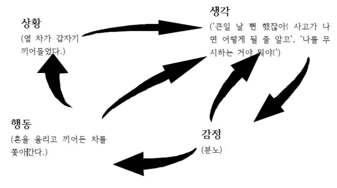 ‘큰일 날 뻔 했잖아! 사고가 나면 어떻게 될 줄 알고’, ‘나를 무시하는 거야 뭐야!’라는 생각이 ‘저 사람은 뭔가 엄청 바쁜 일이 있을거야!’라는 생각으로 쉽게 바뀌지는 않는다. 누구나 자신의 감정과 생각과 행동이 옳다고 믿고 싶기 때문이다. 하지만 위의 과정을 통해 ‘아! 내가 화를 잘 내는 사람이고(다른 사람이 보기에는 화를 내야 될 상황이 아닌데), 평소에 무시 받는다, 피해 받는다는 생각을 많이 하는 사람이라는 것을(다른 사람이 보기에는 무시 받는다, 피해 받는다는 생각을 할 상황이 아닌데) 알게 된다면 그때서야 비로소 생각을 바꿔야 할 필요성을 알게 될 것이다. 그때서야 비로소 ’아 내가 또 화를 내고 있구나! 내가 또 잘 못 생각한 게 있지 않나?‘하고 스스로 생각을 바꾸는 과정을 가지게 될 것이다.