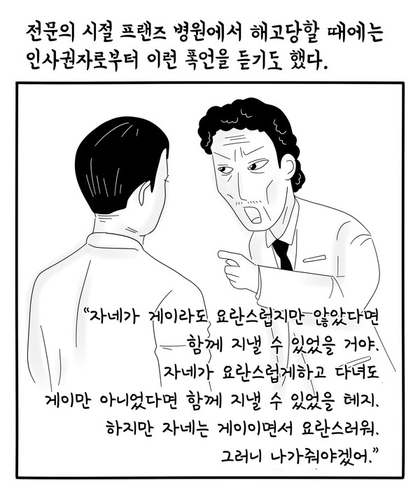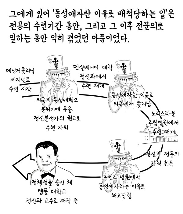 마지막으로 정신과의사인 동성애자들로서 우리는, 부인이나 연인 대신에 병원과 삶을 같이 하는 고유한 능력을 지닌 것 같습니다. 우리들 가운데 상당수는 하루에 20시간씩 병원에서 환자를 보고 지냅니다만 만약 병원의 누군가가 “진실”을 알게 되거나 아는 척하기로 했다면, 그 즉시 우리는 말 그대로 씹히고 내뱉어지는 신세가 되어버릴 겁니다.