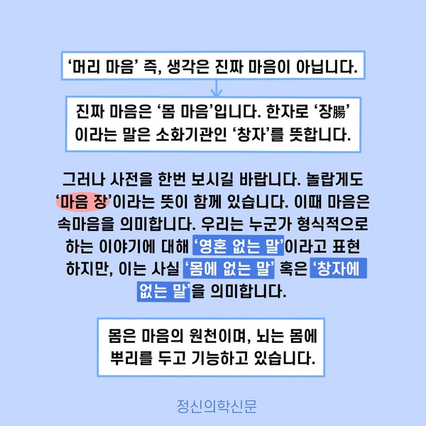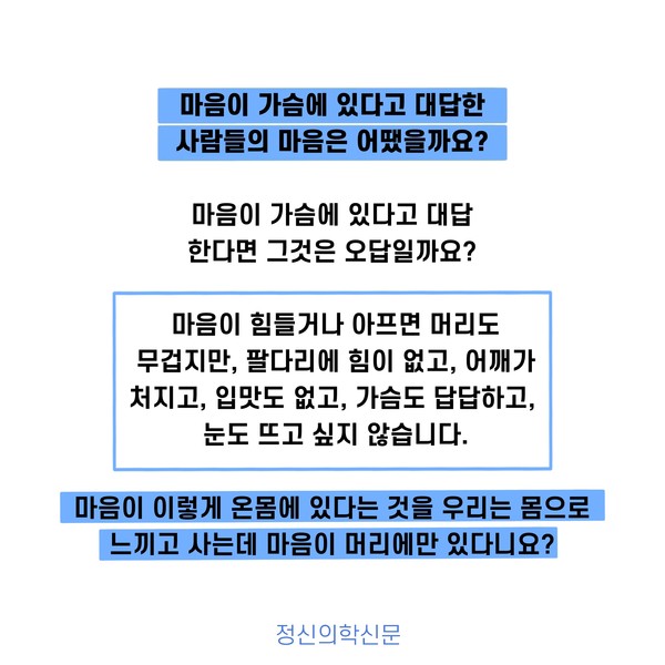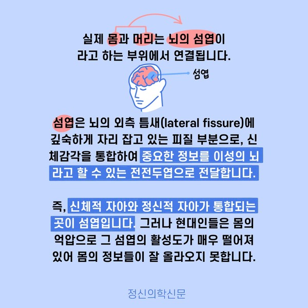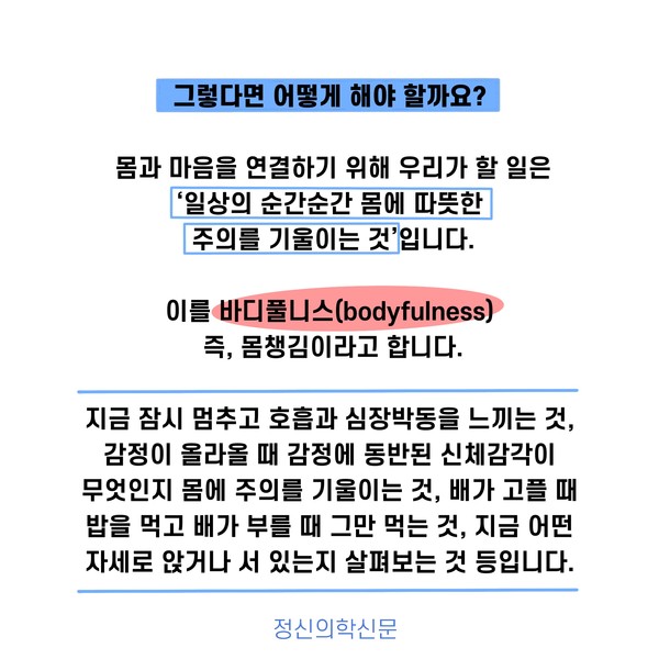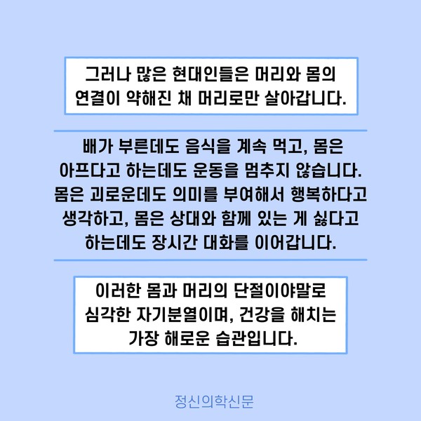 관련기사 몸이 깨어나면 삶이 깨어납니다 문요한 정신건강의학과 전문의 info.psynews@gmail.com 다른기사 보기 저작권자 © 정신의학신문 무단전재 및 재배포 금지 추천 뉴스 매 맞는 여성 증후군 - 사랑이라는 이름의 폭력이 남기는 상처 얼만큼 운동해야 우울증을 예방할까? 약만으로 부족할 때, 우울증에 효과적인 운동은 이것입니다 영웅의 숨겨진 아픔 - 소방관 트라우마 불안이 쉽게 사라지지 않는 뇌과학적 이유 [신간소개] 당신의 상처는 사적이지 않다 수면다원검사를 꼭 받아봐야 하는 사람 (Part 3) 우울증에 좋은 운동은 뭘까 댓글삭제 삭제한 댓글은 다시 복구할 수 없습니다. 그래도 삭제하시겠습니까? 비밀번호 닫기 기사 댓글 0 댓글 접기 댓글 내용입력 비회원 로그인 이름 비밀번호 댓글 내용입력 댓글쓰기 계정을 선택하시면 로그인·계정인증을 통해 댓글을 남기실 수 있습니다. 회원 로그인 비회원 글쓰기 이름 비밀번호 자동등록방지 로그인 옵션 창닫기 주요기사 대인기피증 사회불안장애 극복하기 [Doctor's Mail] 연속된 사업 실패, 재기를 위해 노력하지만 힘듭니다 아직은 괜찮습니다 6화 나는 언제나 완성되어가는 중이다 불안장애와 공황장애 어떻게 다른가요 수면의 질과 ADHD의 상호작용 약만으로 부족할 때, 우울증에 효과적인 운동은 이것입니다