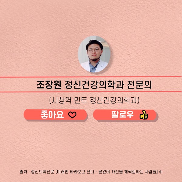 조장원 전문의의 대표칼럼 정신과 약을 복용하는 군인, 어떤 생각이 드시나요? 정신과 약을 복용하는 군인, 어떤 생각이 드시나요? [카드뉴스] 인생이 잘 안 풀리는 사람들의 무의식적인 말버릇 [카드뉴스] 젊은 꼰대 - 수직적 인간관계에 익숙한 사람들 [카드뉴스] 유독 걱정이 많은 사람이 기억하면 좋을 습관 퇴근 후 만사가 귀찮고 재미없다면?