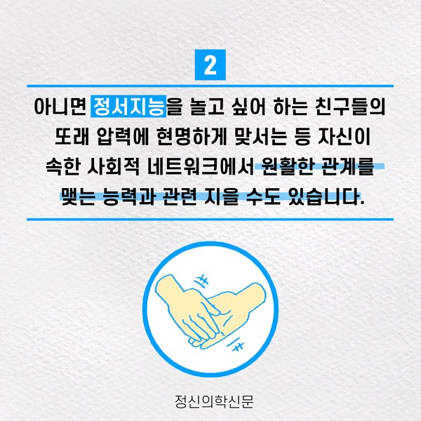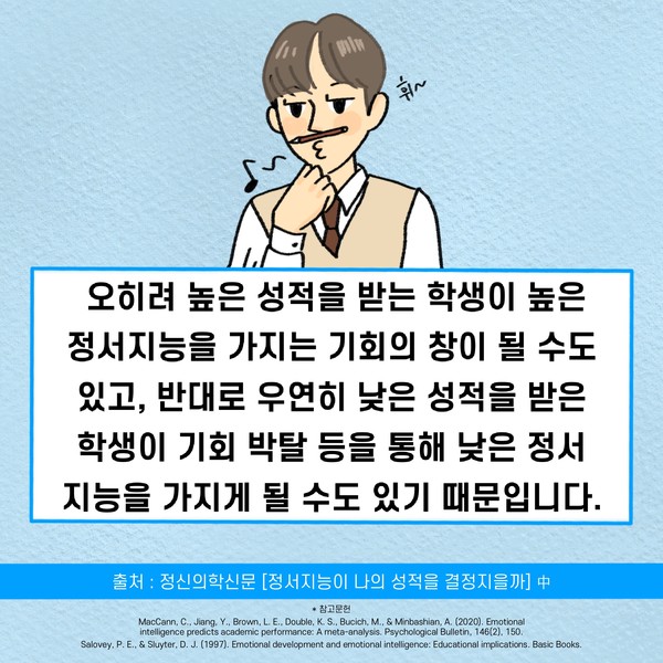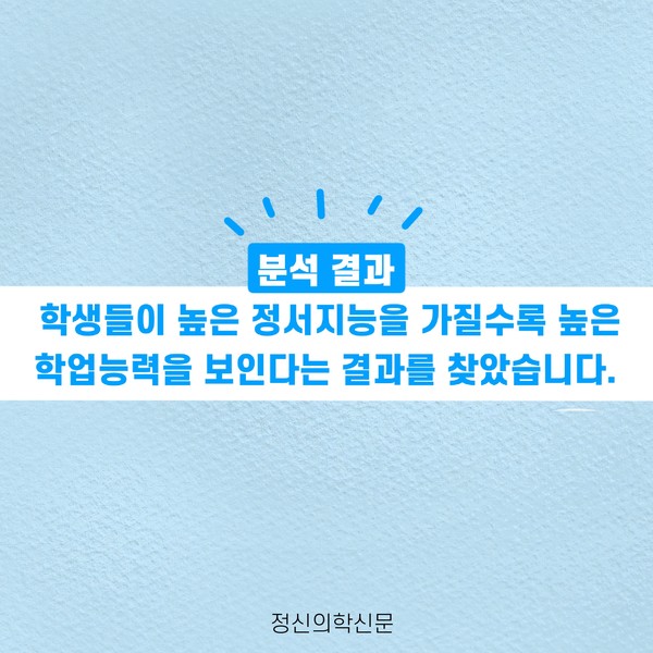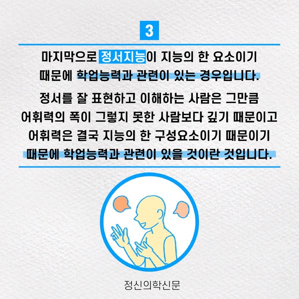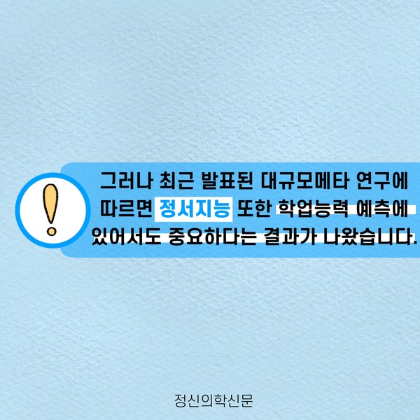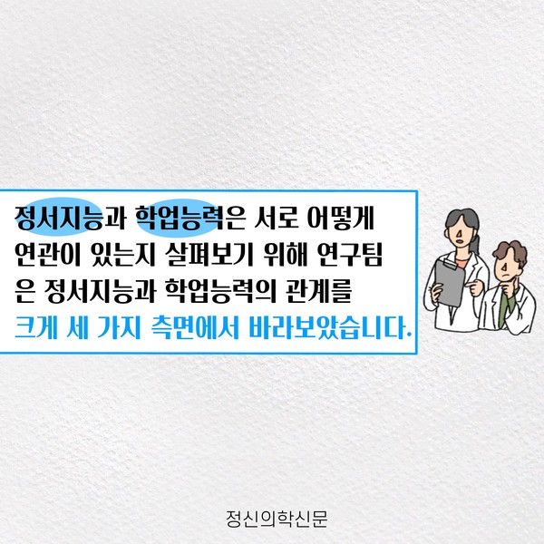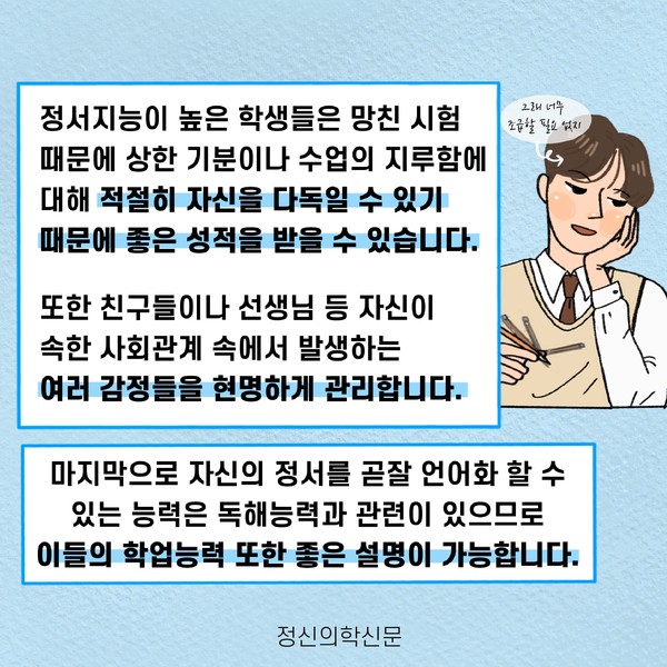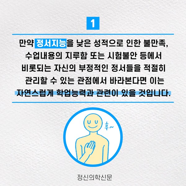 관련기사 정서지능이 나의 성적을 결정지을까 한 우물만 파기가 어려웠던 나, 나도 혹시 다중잠재력자? 키워드 #정서지능 #성적 #공부 #학업능력 정신의학신문 info@psynews.co.kr 다른기사 보기 저작권자 © 정신의학신문 무단전재 및 재배포 금지 추천 뉴스 매 맞는 여성 증후군 - 사랑이라는 이름의 폭력이 남기는 상처 얼만큼 운동해야 우울증을 예방할까? 약만으로 부족할 때, 우울증에 효과적인 운동은 이것입니다 영웅의 숨겨진 아픔 - 소방관 트라우마 불안이 쉽게 사라지지 않는 뇌과학적 이유 [신간소개] 당신의 상처는 사적이지 않다 수면다원검사를 꼭 받아봐야 하는 사람 (Part 3) 우울증에 좋은 운동은 뭘까 댓글삭제 삭제한 댓글은 다시 복구할 수 없습니다. 그래도 삭제하시겠습니까? 비밀번호 닫기 기사 댓글 0 댓글 접기 댓글 내용입력 비회원 로그인 이름 비밀번호 댓글 내용입력 댓글쓰기 계정을 선택하시면 로그인·계정인증을 통해 댓글을 남기실 수 있습니다. 회원 로그인 비회원 글쓰기 이름 비밀번호 자동등록방지 로그인 옵션 창닫기 주요기사 대인기피증 사회불안장애 극복하기 [Doctor's Mail] 연속된 사업 실패, 재기를 위해 노력하지만 힘듭니다 아직은 괜찮습니다 6화 나는 언제나 완성되어가는 중이다 불안장애와 공황장애 어떻게 다른가요 수면의 질과 ADHD의 상호작용 약만으로 부족할 때, 우울증에 효과적인 운동은 이것입니다