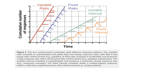 그에 따르면 보상에는 연속적 보상과 간헐적 보상이 있다. 연속적 보상은 같은 행동을 했을 때 계속해서 보상이 주어지는 것이고, 간헐적 보상은 같은 행동을 해도 언제 보상이 주어질지 혹은 보상이 있을지 없을지 모르는 것이다. 모든 행동에 보상을 바라는 게 인간의 심리다. 따라서 누구나 연속적 보상을 바란다. 반면 인간은 언제나 같은 일이 반복되는 예측 가능성에 점점 흥미를 잃는다. 그래서 간헐적 보상에 매력을 느낀다. 간헐적 보상은 네 가지로 나뉜다. 고정비율 보상은 적절한 행동이 정해진 횟수만큼 됐을 때 보상이 제공되는 것이고, 변동비율 보상은 보상을 받기 위해 해야 할 행동이 뭔지 알지만, 횟수는 알지 못하는 것이며, 고정 간격 보상은 특정 시간이 지날 때마다 보상을 지급하는 것이고, 변동 간격 보상은 언제 보상을 받을지는 알 수 없으나 어떤 행동을 하면 보상받을지는 아는 것이다.