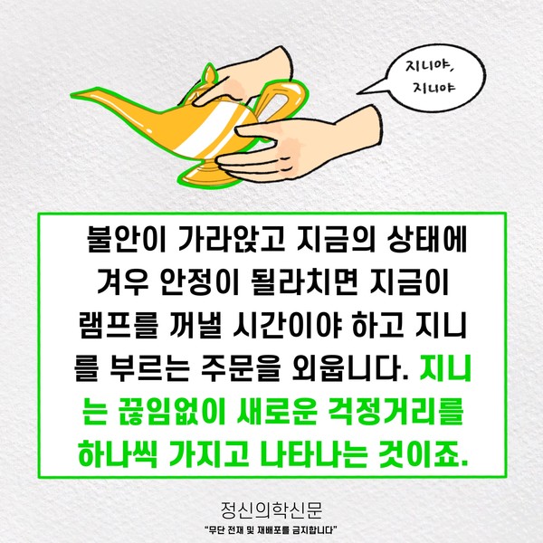 관련기사 램프 증후군 키워드 #램프증후군 #범불안장애 김민경 정신건강의학과 전문의 info.psynews@gmail.com 다른기사 보기 저작권자 © 정신의학신문 무단전재 및 재배포 금지 추천 뉴스 정신과 약, 한 번 먹으면 평생 먹어야 할까? 항우울제에 대한 가장 큰 오해 소아정신과 방문이 필요한 아이의 증상들 아직은 괜찮습니다 11화 봄은 좋지만... 두뇌 생산성을 위한 12가지 법칙 성인 ADHD 약 증량 후 겪는 극심한 부작용, 언제까지 이어질까 트립토판 보충이 성인 ADHD 증상에 미치는 영향 [Sincerely yours,] AI 시대, 여전히 '사람의 다정함'이 필요한 이유가 궁금한 분들에게 우울증 초기증상, 일상에서 먼저 나타나는 작은 변화들 댓글삭제 삭제한 댓글은 다시 복구할 수 없습니다. 그래도 삭제하시겠습니까? 비밀번호 닫기 기사 댓글 0 댓글 접기 댓글 내용입력 비회원 로그인 이름 비밀번호 댓글 내용입력 댓글쓰기 계정을 선택하시면 로그인·계정인증을 통해 댓글을 남기실 수 있습니다. 회원 로그인 비회원 글쓰기 이름 비밀번호 자동등록방지 로그인 옵션 창닫기 주요기사 사이버 불링, 어떻게 예방하고 대처해야 할까? 죽음을 통해 삶을 바라보려는 시도- 자살적 정체성(Suicidal Identity) 이해하기 AI에게 계속 확인할수록 강박이 심해지는 이유 [Sincerely yours,] AI 시대, 여전히 '사람의 다정함'이 필요한 이유가 궁금한 분들에게 두뇌 생산성을 위한 12가지 법칙 트립토판 보충이 성인 ADHD 증상에 미치는 영향