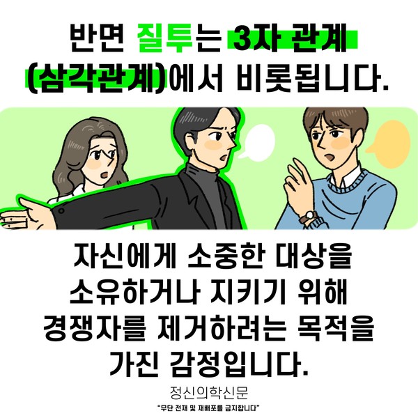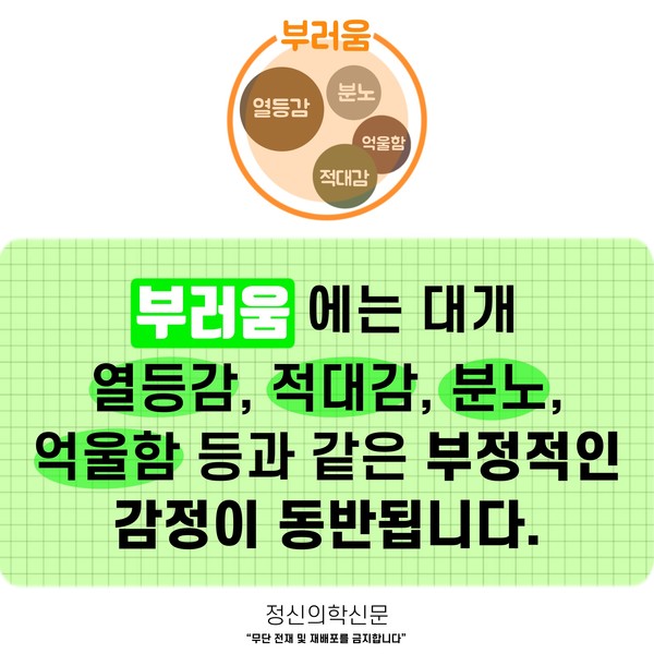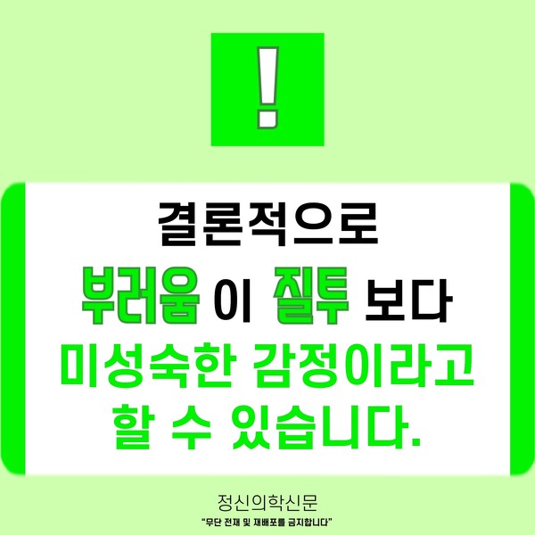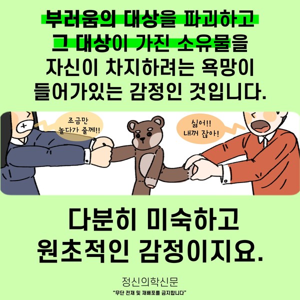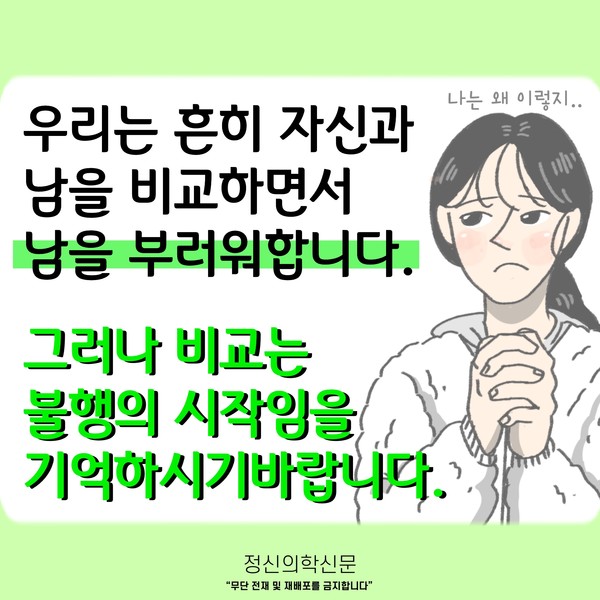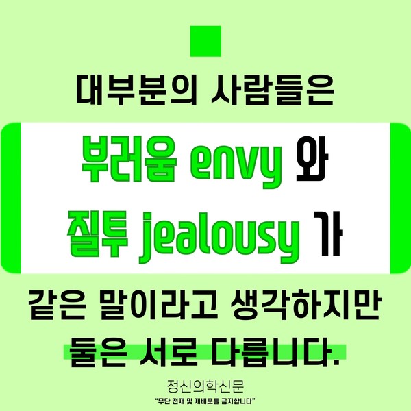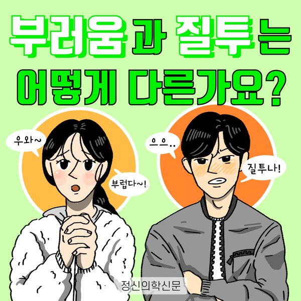 관련기사 ‘소확행’을 권하는 정신의학적 이유 SNS가 주는 좌절에서 벗어나려면? [Doctor's Mail] 스스로가 실패한 인생처럼 느껴져요 부러움으로부터 자유로워지는 길 [Doctor's Mail] 사랑받지 못할 것 같아 불안하고 질투가 납니다 키워드 #부러움 #질투 #부러움과질투의차이 #비교 김재원 정신건강의학과 전문의 info.psynews@gmail.com 다른기사 보기 저작권자 © 정신의학신문 무단전재 및 재배포 금지 추천 뉴스 정신과 약, 한 번 먹으면 평생 먹어야 할까? 항우울제에 대한 가장 큰 오해 소아정신과 방문이 필요한 아이의 증상들 아직은 괜찮습니다 11화 봄은 좋지만... 성인 ADHD 약 증량 후 겪는 극심한 부작용, 언제까지 이어질까 두뇌 생산성을 위한 12가지 법칙 트립토판 보충이 성인 ADHD 증상에 미치는 영향 요즘 아이들에게 더 중요해진 마음의 진료 우울증 초기증상, 일상에서 먼저 나타나는 작은 변화들 댓글삭제 삭제한 댓글은 다시 복구할 수 없습니다. 그래도 삭제하시겠습니까? 비밀번호 닫기 기사 댓글 2 댓글 접기 댓글 내용입력 비회원 로그인 이름 비밀번호 댓글 내용입력 댓글쓰기 계정을 선택하시면 로그인·계정인증을 통해 댓글을 남기실 수 있습니다. 회원 로그인 비회원 글쓰기 이름 비밀번호 자동등록방지 로그인 옵션 창닫기 댓글목록 최신순 추천순 욕설, 타인비방 등의 게시물은 예고 없이 삭제 될 수 있습니다. 정신병자 2022-07-20 12:14:33 더보기 삭제하기 우리말 부러움과 영어 envy의 의미가 다른 거겠지 우리말 부러움은 축하의 의미로 쓰이기도 하니까 가나다 2022-01-04 13:46:59 더보기 삭제하기 과연 그런가요?... 공감도 안되고 틀린 정보 같네요 주요기사 사이버 불링, 어떻게 예방하고 대처해야 할까? 죽음을 통해 삶을 바라보려는 시도- 자살적 정체성(Suicidal Identity) 이해하기 AI에게 계속 확인할수록 강박이 심해지는 이유 [Sincerely yours,] AI 시대, 여전히 '사람의 다정함'이 필요한 이유가 궁금한 분들에게 두뇌 생산성을 위한 12가지 법칙 트립토판 보충이 성인 ADHD 증상에 미치는 영향