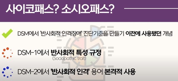 그러면 사이코패스, 소시오패스는 어디서 나온 용어일까요? 이는 반사회적 인격장애라는 진단 기준을 DSM에서 만들기 이전 전통적인 정신의학, 그러니까 ‘분석적 정신의학’에서 나오기 시작하였던 개념입니다. 정신분석적 차원에서 정신병질자(Psychopath)의 특성을 분류하고 있어 왔는데, 그 개념을 아울러 통계적 진단 체계에 편입시킨 것이 반사회적 인격장애라고 이야기할 수 있습니다. 즉, 역사적으로 보자면 사이코패스라는 단어가 더 먼저 사용되었다는 것입니다. 실제로 DSM-1을 보면 반사회적 인격이라는 진단명 없이, Sociopathic trait이라는 성격 특성을 규정하고 있으며, DSM-2에 이르러서야 반사회적 인격이라는 용어가 사용되었습니다.