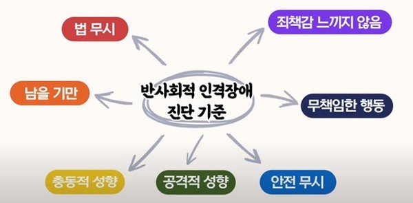 반사회적인 행동들을 보이는 정신과적인 질환들에는 여러 가지 이름들이 있습니다. 사이코패스, 소시오패스, 반사회적 인격장애 등등 여러 가지 이름들이 범죄자들이나 영화 속 주인공들의 성격을 묘사할 때 사용되곤 합니다.
