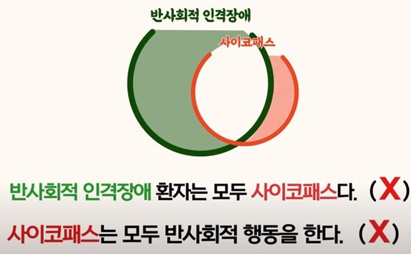 반사회적인 행동-범죄, 폭력 등을 성격적으로 일삼는다고 한다면 ‘반사회적 인격장애’로 진단될 수는 있겠지만, 그렇다고 해서 사이코패스처럼 완전히 냉담하고 피상적이지는 않을 수 있다는 것입니다. 마찬가지로, 드물지만 사이코패스 같은 성격을 가졌으면서도 반사회적 행동을 하지는 않을 수도 있습니다.