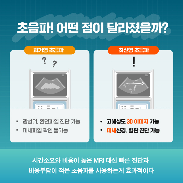 “그러나 최근 근, 골격계 전용 초음파는 24Mhz의 고해상도 및 미세신경과 혈관까지 탐침이 가능하다. 따라서 더 이상 MRI 검사의 부담을 느낄필요가 없다. 실제 견주관절학회 및 영상의학회 발표 및 SCI 저널에서도 초음파와 MRI 검 의 정확도는 오차범위 내에 있을만큼 차이가 없다.” 고 설명했다.