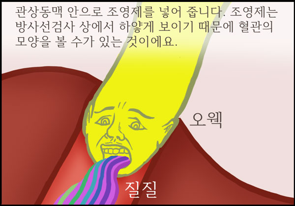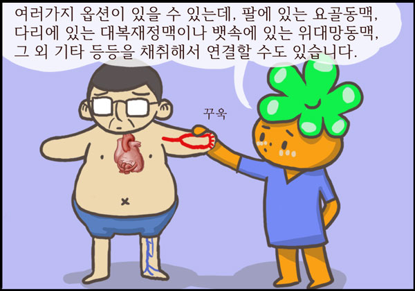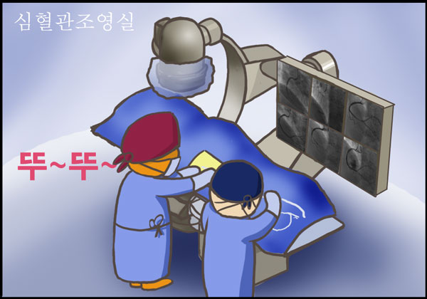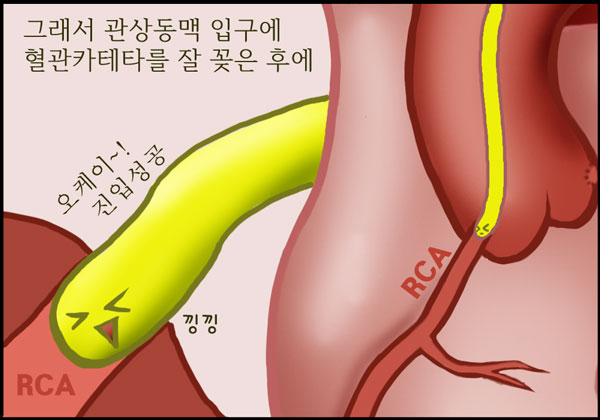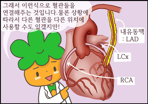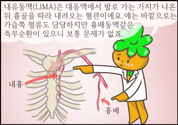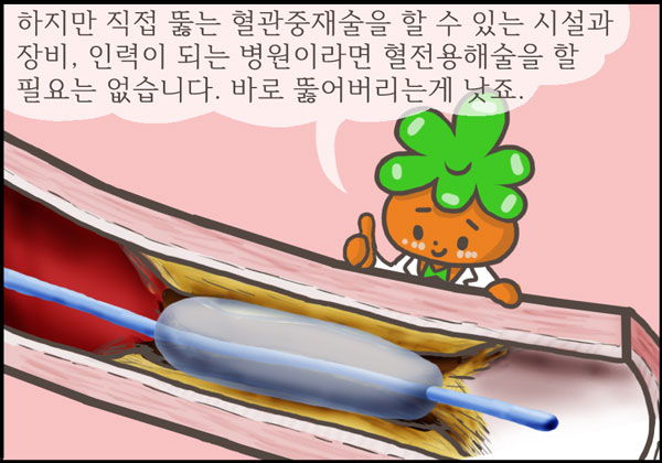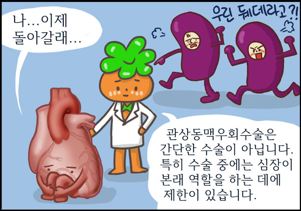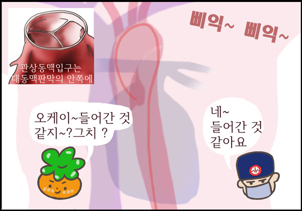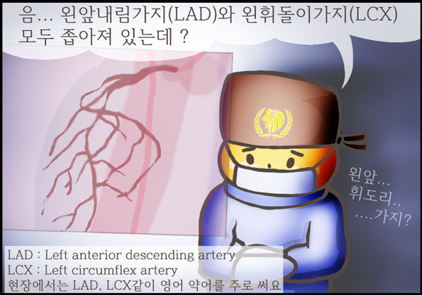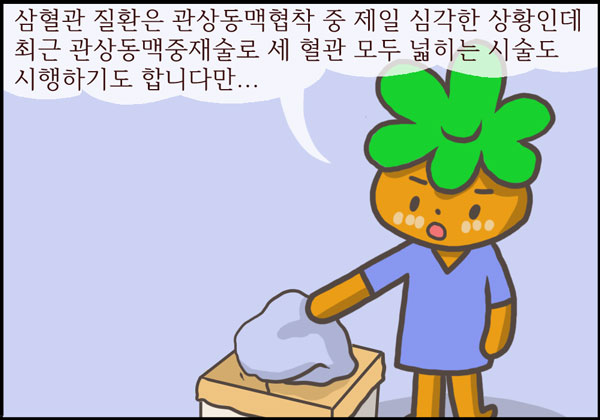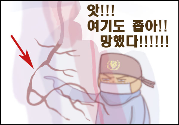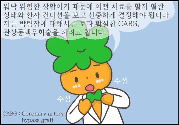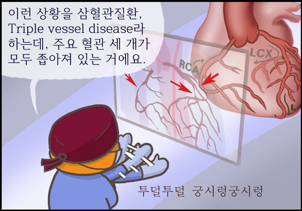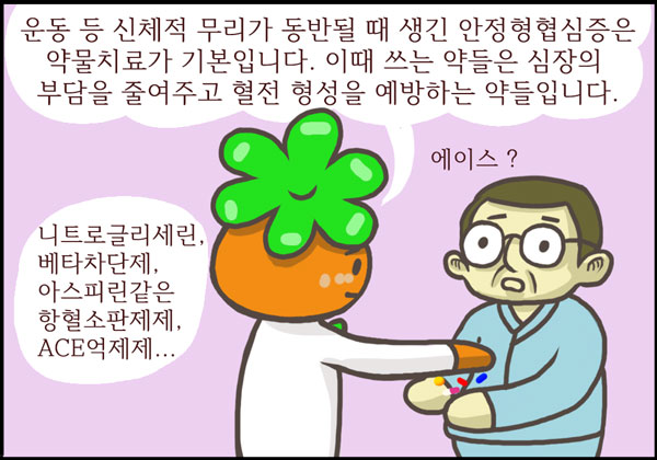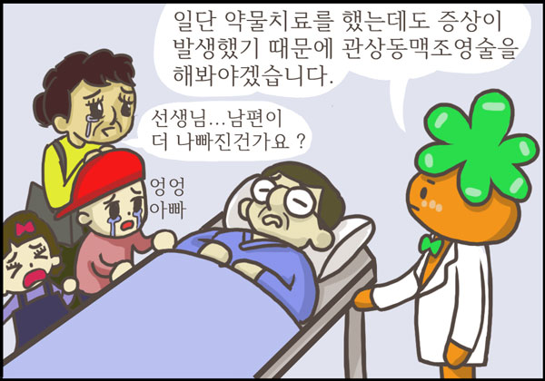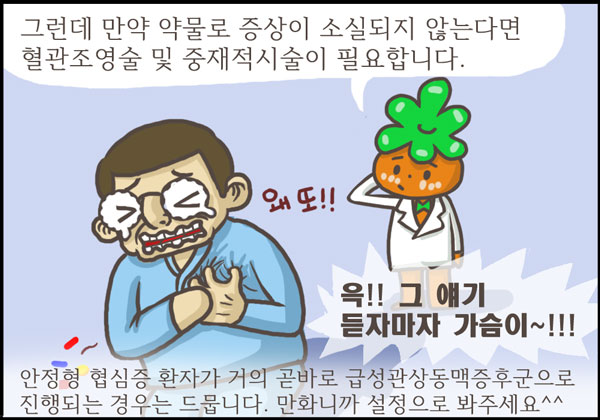 만화에서 많이 설명하지는 않았지만 약물복용은 허혈성 심장질환에서 기본 치료에 해당됩니다. 쓰는 약들은 니트로글리세린 같은 응급상황에서 흉통을 없애주는 약부터 베타차단제, 칼슘채널억제제, ACE 억제제 같이 혈압약으로 통상 쓰는 약도 있고 아스피린 처럼 피를 묽게 해주는 약도 있습니다. 이런 약들은 결과적으로 심장의 업무 부담을 줄여주고, 심장으로 가는 혈류를 개선하고, 차후에 심장에 혈전이 생기는 것을 예방하는 목적으로 사용하게 됩니다.