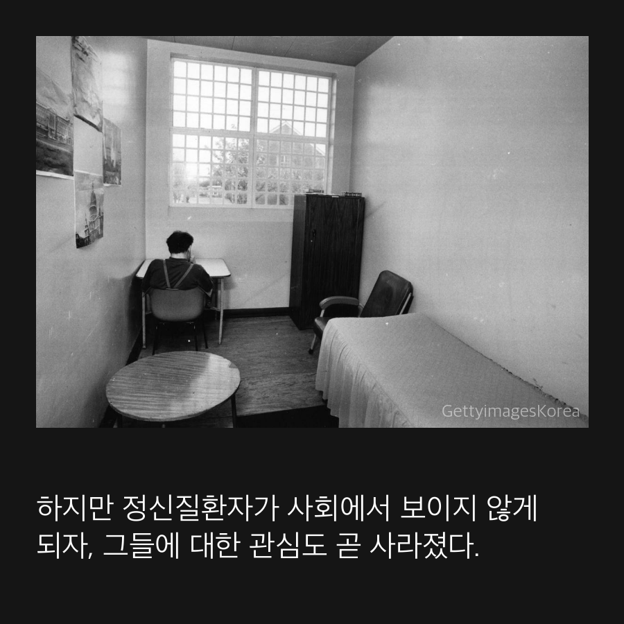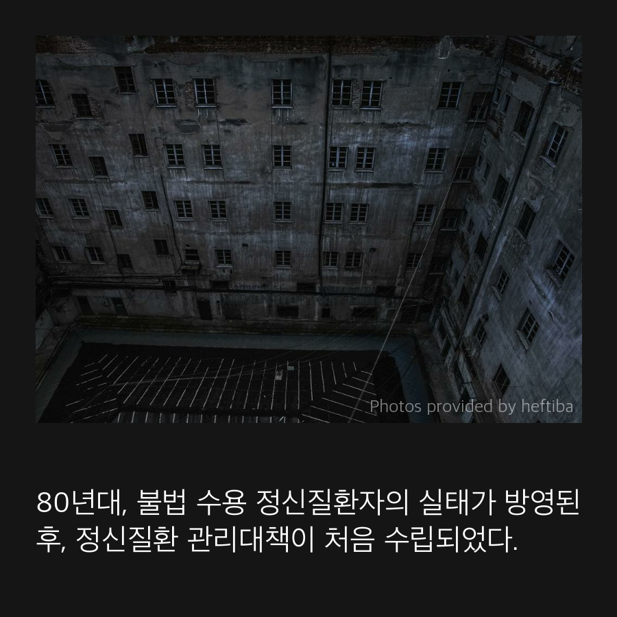 1983년 한 사회고발 프로그램에서 기도원에 수용된 정신질환자의 실태가 방영된 이후, 1984년 정신질환 관리 종합대책이 처음 수립되었다. 하지만 전문 연구에 기초한 정책이 아닌 미봉책에 불과했다. 정책에 의한 효과는 국가관리 시스템이 전무한 요양시설에서, 그나마 국가가 관리할 수 있는 정신병원으로 환자들을 이동시킨 것에 그쳤다. 전국의 정신병원에 입원해 있는 환자 수는, 병원에 있는 환자용 침대인 ‘병상’의 개수로 유추할 수 있다. 이 숫자가 1984년 12,392 병상에서 1998년 51,840 병상으로 증가했다는 것은, 그만큼의 환자가 요양시설에서 정신병원으로 이동한 것을 증명하는 자료다. 환자들은 비교적 안전한 정신 병원으로 이동할 수 있었다. 사회는 정신질환자가 최소한의 인권을 보장받을 수 있게 된 것에 감사하며 안도했다.