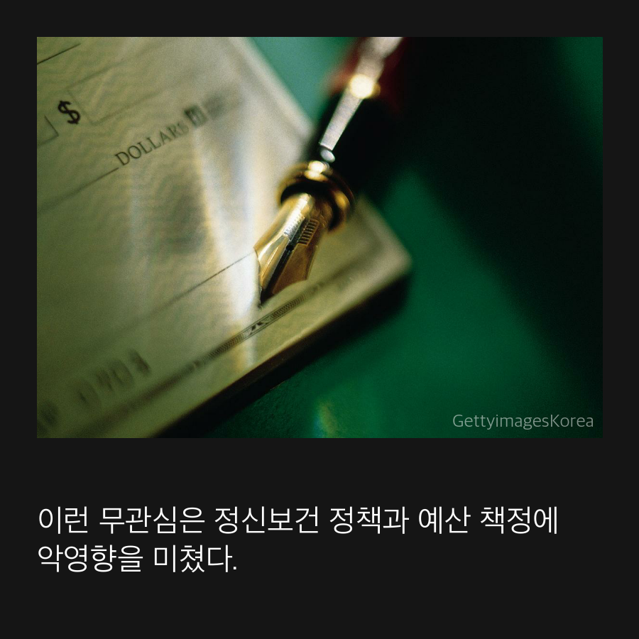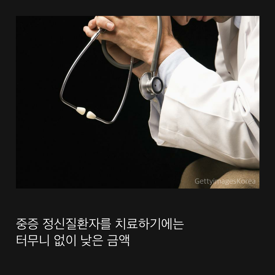 하지만 정신질환자의 치료와 재활에는 그 누구도 관심이 없었다. 정신질환자가 병원 안에만 있어, 눈에 보이지 않았기 때문이다. 이런 무관심은 정신과 환자에 대한 정책적 홀대와 터무니없이 적은 예산책정으로 나타났다. 의료기관마다 약 만원 정도의 차이는 있지만, 정신과 의료 급여 환자의 하루 입원 치료비는 3만7천원이다. 환자가 어떤 약을 처방받든, 어떤 재활 혹은 직업 훈련을 받든 상관없이 정부는 병원에게 환자 한 명 당 하루 3만7천원을 준다. 퇴원 후의 상황은 더 좋지 않았다. 의료급여 정신과 환자가 외래 치료를 받으면 정부는 2770원을 지원해줬다. 의료보험 감기환자의 10%에 해당하는 금액이었다. 그렇기 때문에 정신 병원은 환자에게 최적의 의료를 제공하는 것보다 환자 수를 늘리는 것을 선택하게 됐다. 병원의 무리한 환자 수 늘리기 경쟁은 종종 범법행위에 이르기까지 했다. 미흡한 국가 정신보건 정책으로, 몇몇 건실한 의료기관을 제외한 대다수의 정신 의료기관에서 제공하는 치료는 하향평준화 되고, 사회로부터 신뢰를 잃어가기 시작했다.