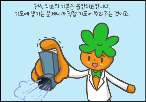천식 치료의 기본은 흡입치료입니다. 흡입제를 흡입해주면 약물이 기관지의 점막으로 들어가서 직접 작용해주는 것이죠.