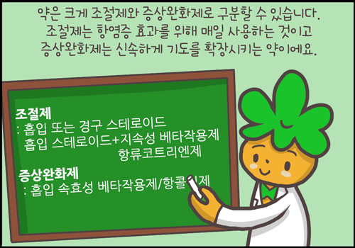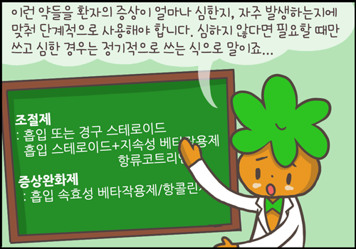 조절제에는 흡입 또는 경구 스테로이드를 사용하거나 흡입 스테로이드와 지속성 베타작용제나 항류코트리엔제를 병용합니다.