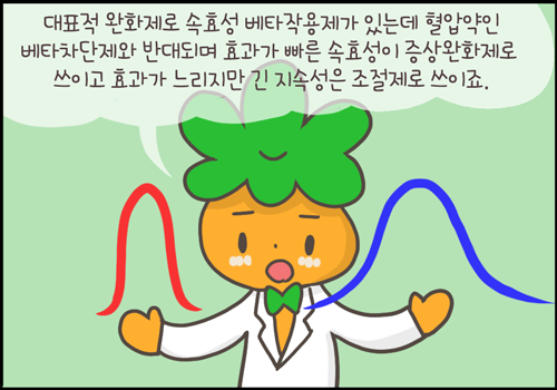 대표적인 완화제인 속효성 베타작용제는 혈압약으로 흔히 사용되는 베타차단제와 반대되는 효과를 냅니다. 효과가 빠른 속효성이 증상완화제로 쓰이고 효과가 느리지만 긴 지속성은 조절제로 사용됩니다.