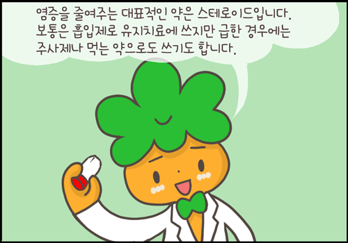 염증을 줄여주는 대표적인 약은 스테로이드입니다. 보통은 흡입제로 유지치료에 쓰지만 급한 경우에는 주사제나 먹는 약으로도 씁니다. 스테로이드는 항염효과 때문에 알레르기성 아토피성 질환 뿐만 아니라 자가면역질환에 이르기까지 정말 많이 쓰이는 약입니다.
