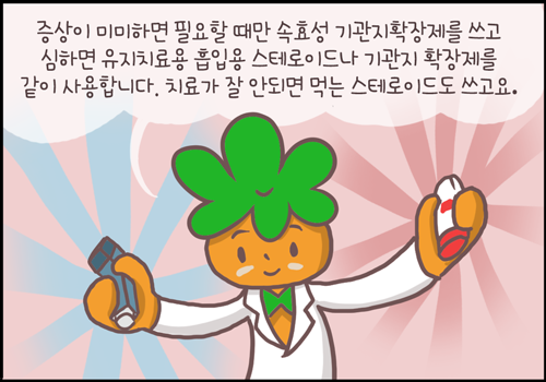 증상이 미미하면 필요할 때만 속효성 기관지확장제를 쓰고 심하면 유지치료용 흡입 스테로이드나 기관지 확장제를 같이 사용합니다. 치료가 잘 안될 때 스테로이드를 복용하기도 합니다.