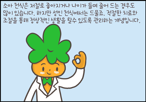 천식은 영원한 것인지 궁금하신 분들이 있을 것입니다. 소아 천식은 저절로 좋아지거나 나이가 들면서 줄어드는 경우도 많이 있습니다. 흔히 얘기하는 아토피 행진 (atopic march) 중 하나인 천식인 만큼 다른 질환, 아토피성 피부염이나 알레르기 비염을 경험할 가능성은 높지만 말입니다.