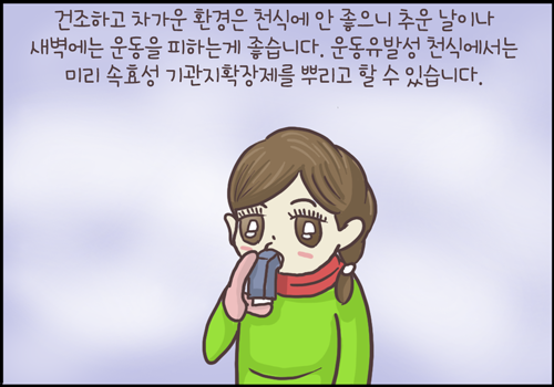 건조하고 차가운 환경은 천식에 안 좋은 경우가 많습니다. 따라서 추운 날이나 새벽에는 가능하면 운동을 피하는 것이 좋습니다. 특히, 운동 유발성 천식에서는 주의가 필요하며 운동 전에 미리 속효성 기관지확장제를 뿌리가 하는 것이 좋습니다.