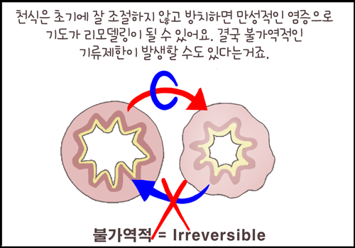 천식은 가역적인 기류제한이 발생하는 질환이지만 장기간 방치된다면 만성적인 염증에 의해 기도가 좁은 상태로 굳어져 불가역적인 상태로 변할 수 있습니다. 장기적인 관리가 중요한 이유입니다.