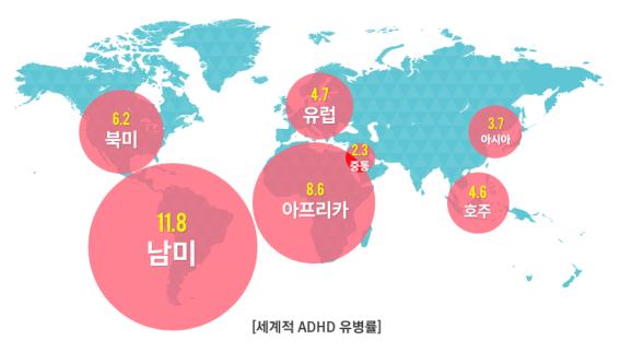 지역별로 유병률은 약간씩의 차이를 보이는데, 가장 많은 연구가 시행된 북미와 유럽은 각각 6.2%와 4.7%, 호주는 4.6%, 아시아는 3.7%, 중동은 2.3%로 조사되었다. 아프리카는 8.6%, 남미는 11.8%로 조사되었으나 신뢰도가 다소 떨어져서 실제 ADHD의 유병률이 이 정도일지는 다소 의심스럽다고 할 수 있다.