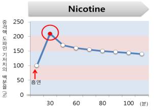 그림 3에서 보듯이 니코틴은 음식(그림 1), 섹스(그림 2)와 같은 자연적인 강화물에 비해 도파민 농도 상승이 높고 보상 작용이 더 강하다.