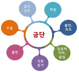 니코틴이 혈액 내에서 농도가 절반이 되는데 까지 걸리는 시간은 약 2시간 정도이기 때문에 흡연 갈망과 함께 니코틴 금단 증상(그림 4)은 빨리 나타난다.