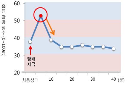 흡연 갈망은 금연을 어렵게 하는 요소이지만 초기 5분을 잘 넘기면 훨씬 견디기 쉬워진다. 그림 5에서 보는 것처럼 흡연 갈망을 일으키는 자극이 주어진 후 5분이 지나면 그 정도가 줄어들기 때문이다.