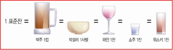 5. 음주량은 각 주종별 표준잔으로 하루 성인 남성 2잔, 성인 여성과 노인은 1잔을 넘지 않도록 하는 것이 좋다.