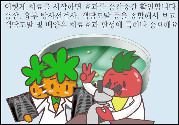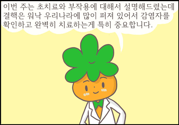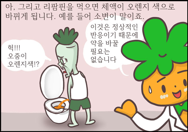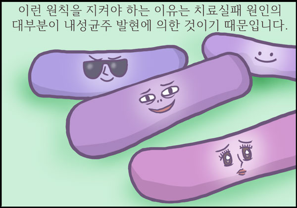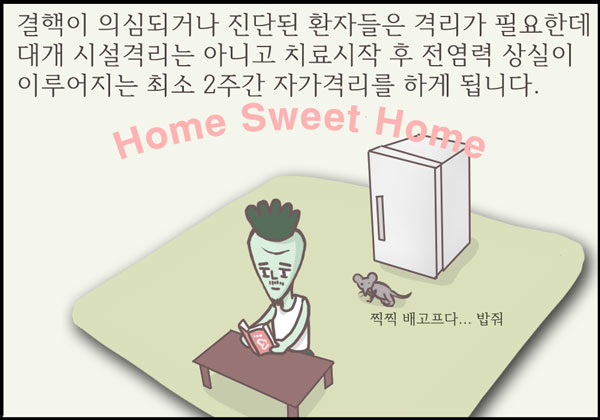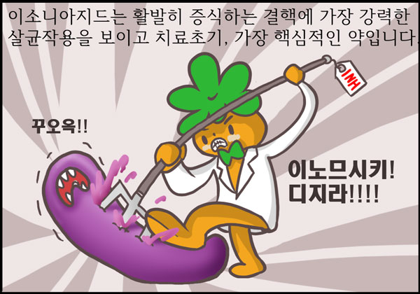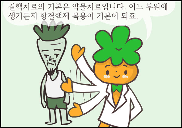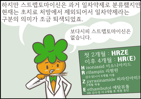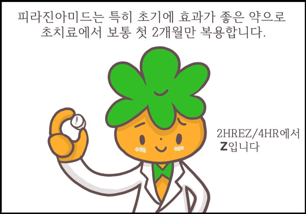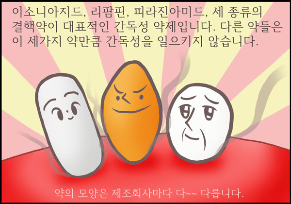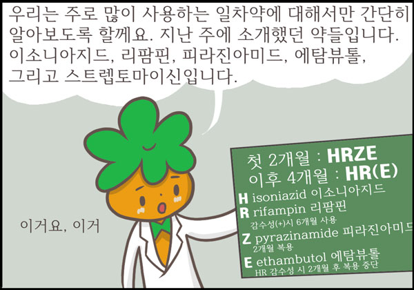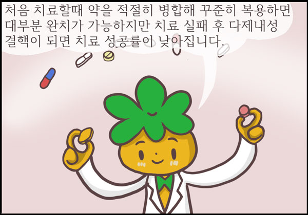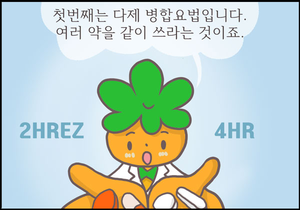 만화의 마지막에서 설명하고 있지만 결핵약 복용의 원칙은 첫째, 다제병합요법. 둘째, 정확한 용량의 복용. 셋째, 6개월 이상 장기복용입니다. 여러 종류의 약을 반년 이상 매일 꾸준히 먹는 일이 쉽지 않습니다. 특히, 결핵약은 여러가지 부작용을 일으킬 수도 있기 때문에 더더욱 그렇기도 하죠. 하지만 결핵 유병률이 높은 국가인 만큼 이에 대한 조절을 위해서는 이런 원칙들이 철저히 지켜져야 합니다.