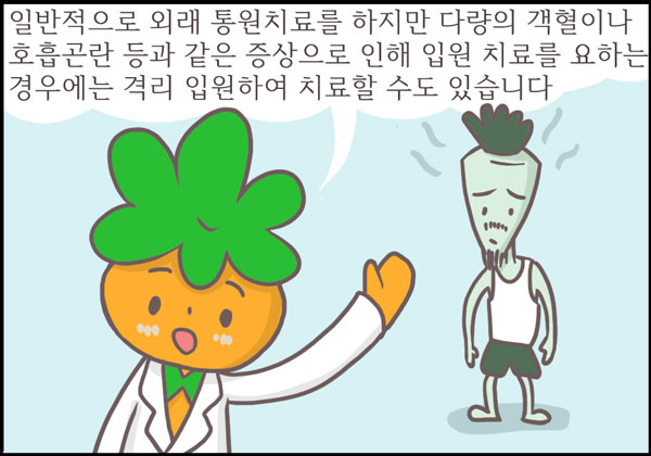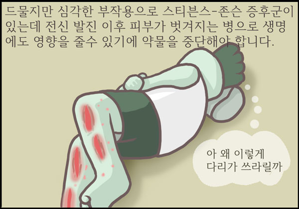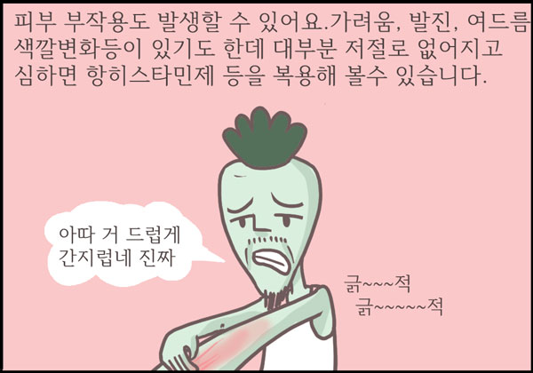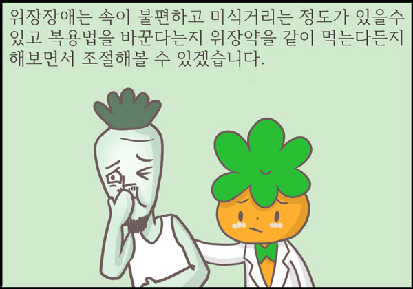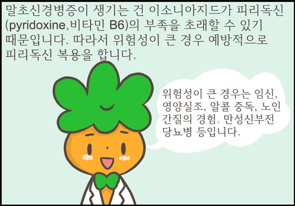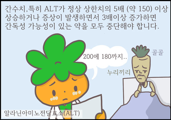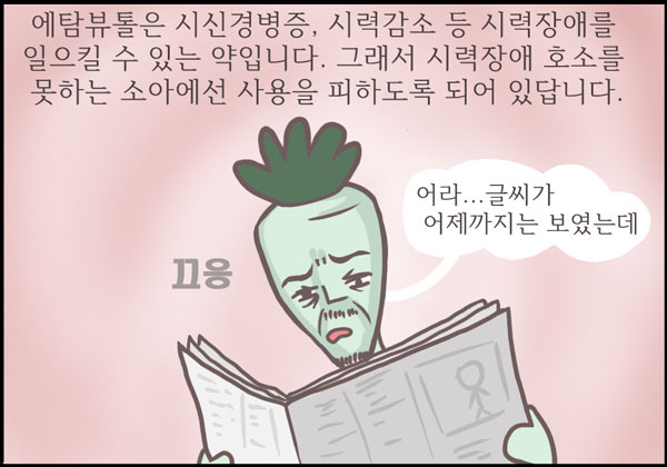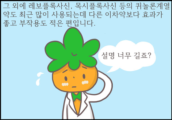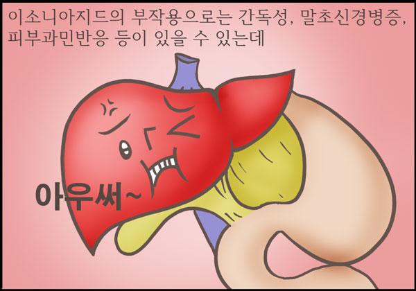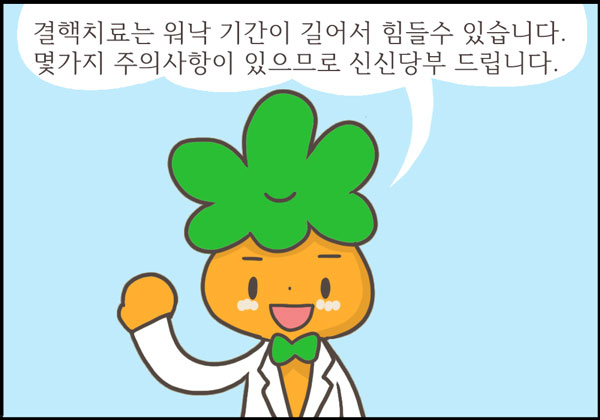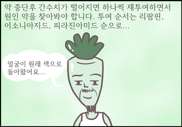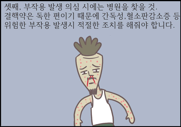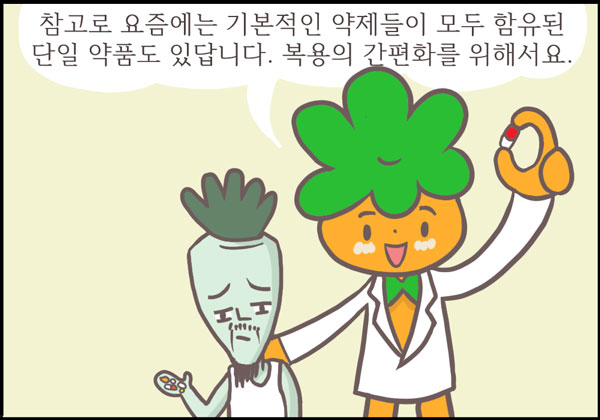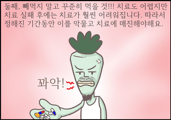 만화의 마지막에서 설명하고 있지만 결핵약 복용의 원칙은 첫째, 다제병합요법. 둘째, 정확한 용량의 복용. 셋째, 6개월 이상 장기복용입니다. 여러 종류의 약을 반년 이상 매일 꾸준히 먹는 일이 쉽지 않습니다. 특히, 결핵약은 여러가지 부작용을 일으킬 수도 있기 때문에 더더욱 그렇기도 하죠. 하지만 결핵 유병률이 높은 국가인 만큼 이에 대한 조절을 위해서는 이런 원칙들이 철저히 지켜져야 합니다.
