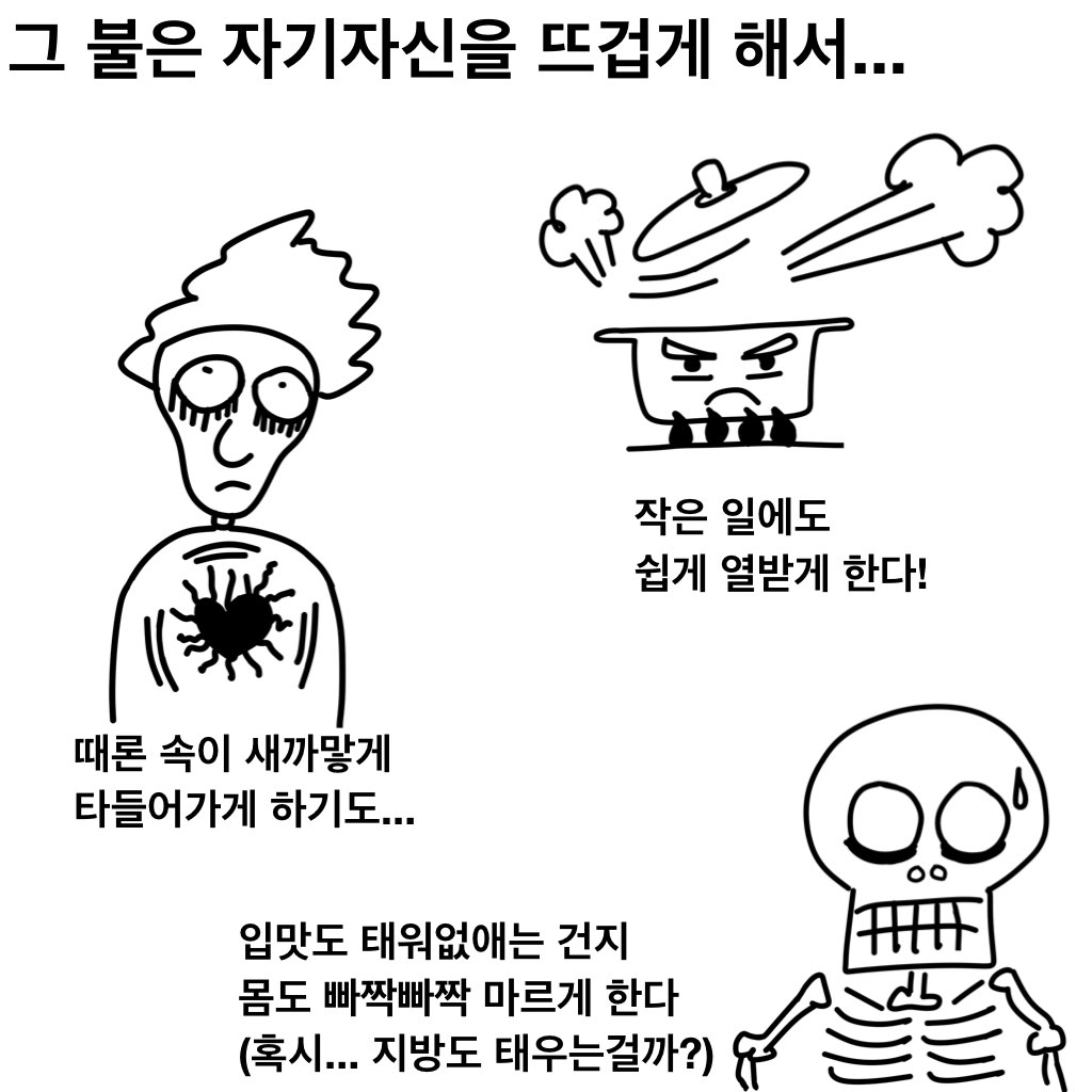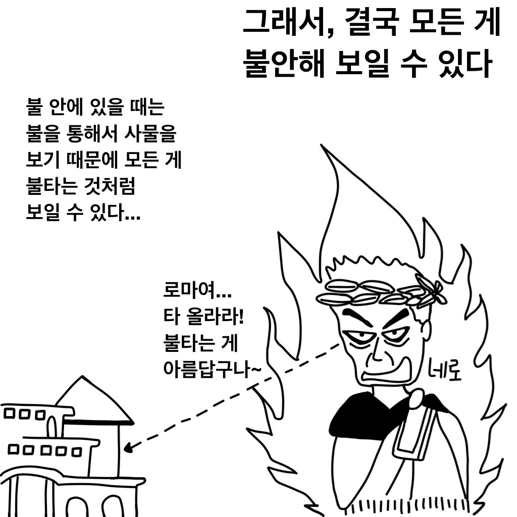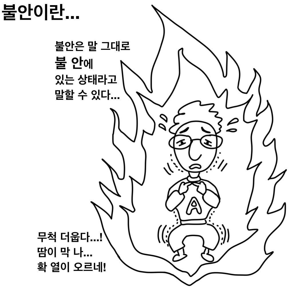 불안을 불에 비유한다는 것이 다소 억지스러운 부분이 있긴 해도, 그 느낌이나 속성상 오늘 내용에서처럼 비슷한 점은 분명히 있다. 게다가, 우리는 흔히 불안이 심할 경우 '불안에 휩싸인다'는 표현을 많이 쓰는데 사실 불이나 화염 또한 휩싸인다는 말을 많이 쓰니까, 한 번쯤 이런 비유로 생각해 보는 것도 의미가 있어 보인다.