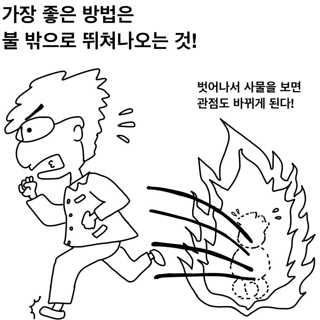 그러한 관점에서 볼 때, 불안이라는 것은 그 불 안에 있을 경우에는 어떠한 방법들을 시도해본다고 하더라도, 별 소용이 없거나 잠시 나아진 듯 보일 뿐이지 완전한 해결책이 될 수는 없는 것 같다. 그 안에서 벗어나는 것이 가장 좋은 방법인데, 그게 실제로는 쉽지 않다. 하지만, 불가능한 것은 아니므로 내가 불 안에 있다는 사실을 깨닫는 것이 무엇보다 중요하고 그것이 바로 벗어남의 시작이 될 수 있다.