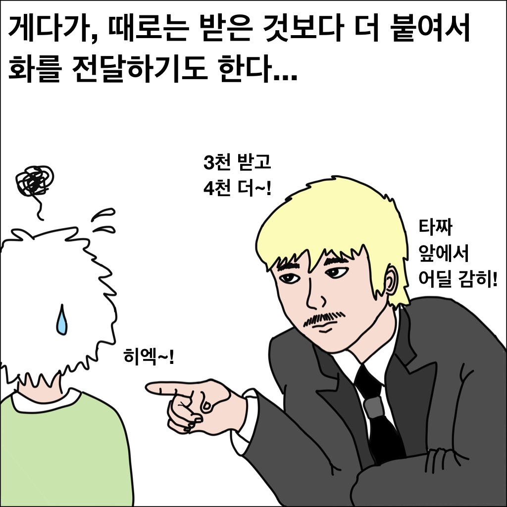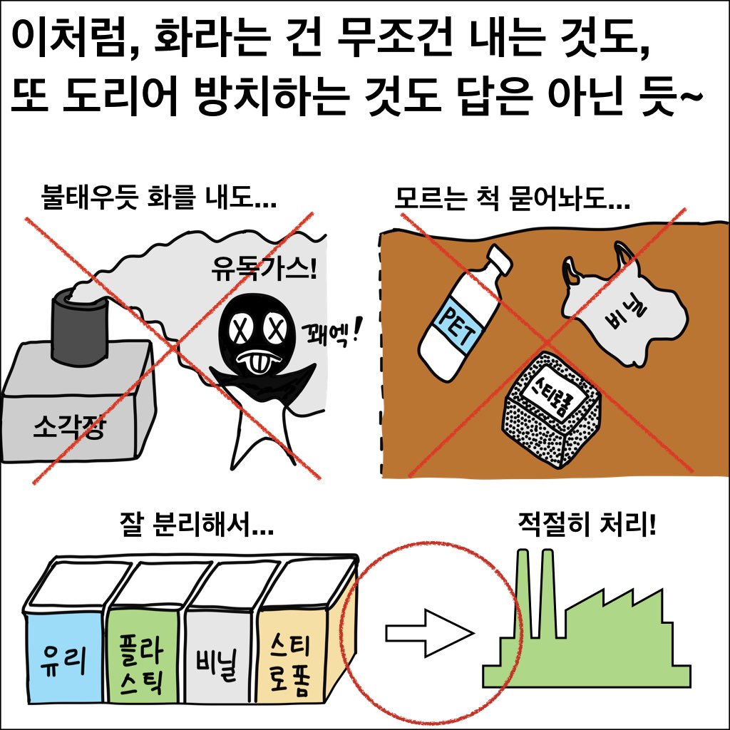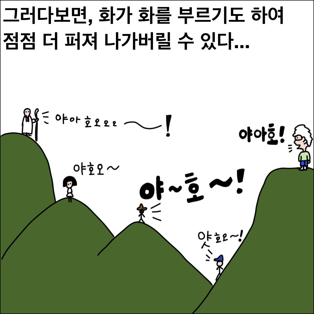 때로는 화를 전달하다 보면 내 감정까지 얹어서 더 많이 화를 내기도 하고, 서로 화를 내다보면 안 지려고 하다가 그 화를 증폭시키거나 더 퍼뜨리기도 한다. 또, 웬만해서 화는 깎아주지 않고 뭐라도 하나 더 얹어서 후하게(?) 주는 경우가 많다.