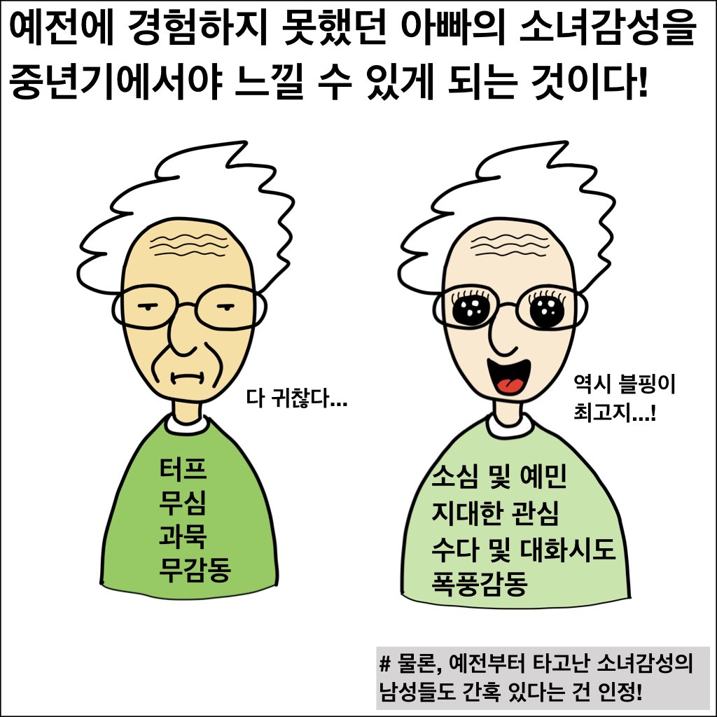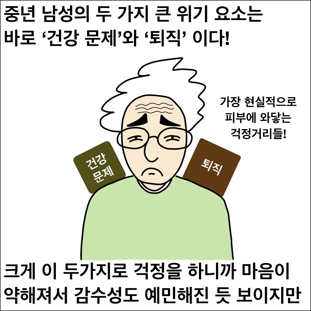 이러한 중년 남성의 변화는 실제로 가족들과 자기 자신 모두를 당황케 한다. 하지만, 이런 변화가 꼭 나쁘다고 할 수만은 없다. 오히려 여성성의 장점을 잘 활용한다면, 권위에서 벗어나 대화도 자주 하고 정서적 풍요로움을 느낄 좋은 기회일 수 있으니까 말이다. 어쩌면 중년에서 노년으로 가는 또 하나의 적응 과정으로써, 반드시 필요한 업데이트를 하는 중이라고 생각해볼 수도 있지 않을까?