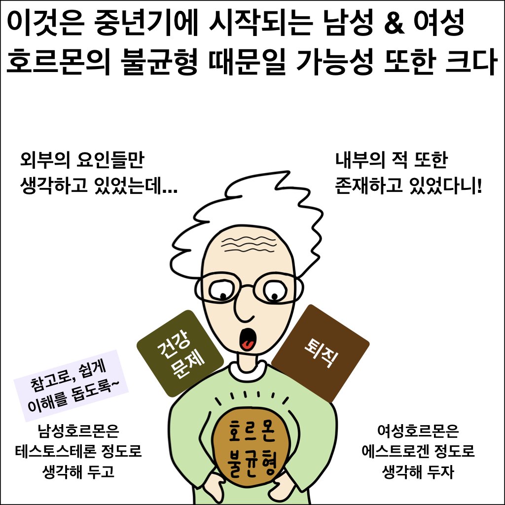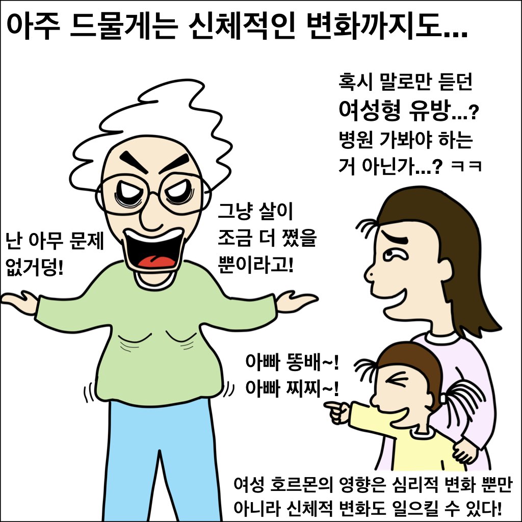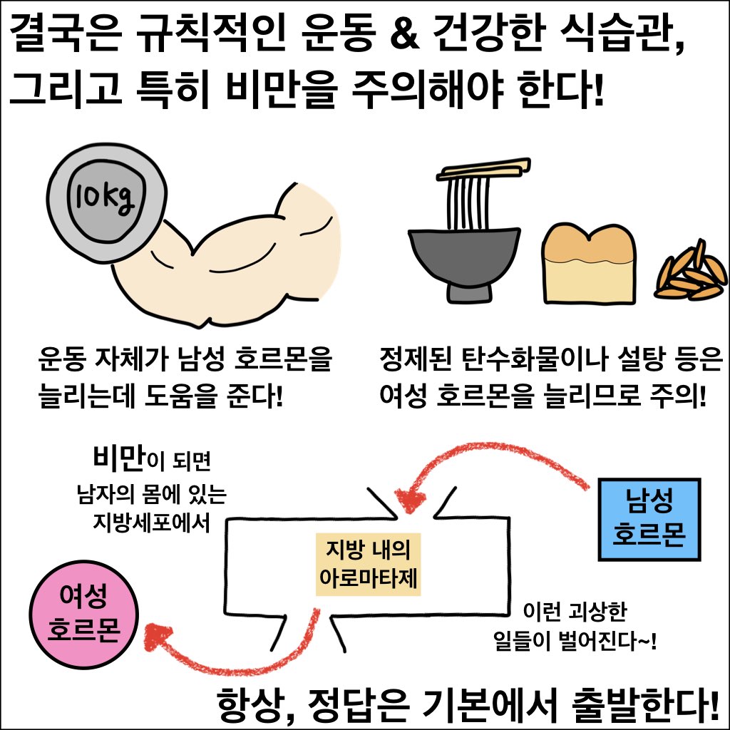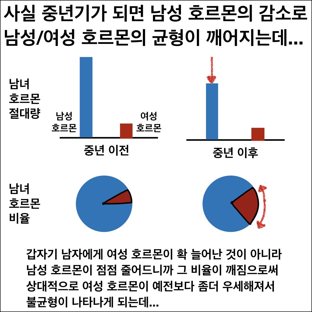 호르몬이라는 것은 그 절대량보다는 비율이 상당히 중요한 것 같은데, 아마도 그 세계에서는 항상성을 유지하는 것이 핵심이라서 그런 게 아닌가 싶다. 실제로 남성에서는 30대 이후부터 매년 약 1% 정도씩 남성호르몬이 감소하는데, 그런 이유로 중년에 나타나는 증상들을 '남성 갱년기'로 흔히 설명한다. 이와 더불어, 남성&여성호르몬의 비율 자체가 깨지면서 심리적(드물게 신체적으로까지)으로 소녀감성 같은 여성적 성향을 보이기도 한다.