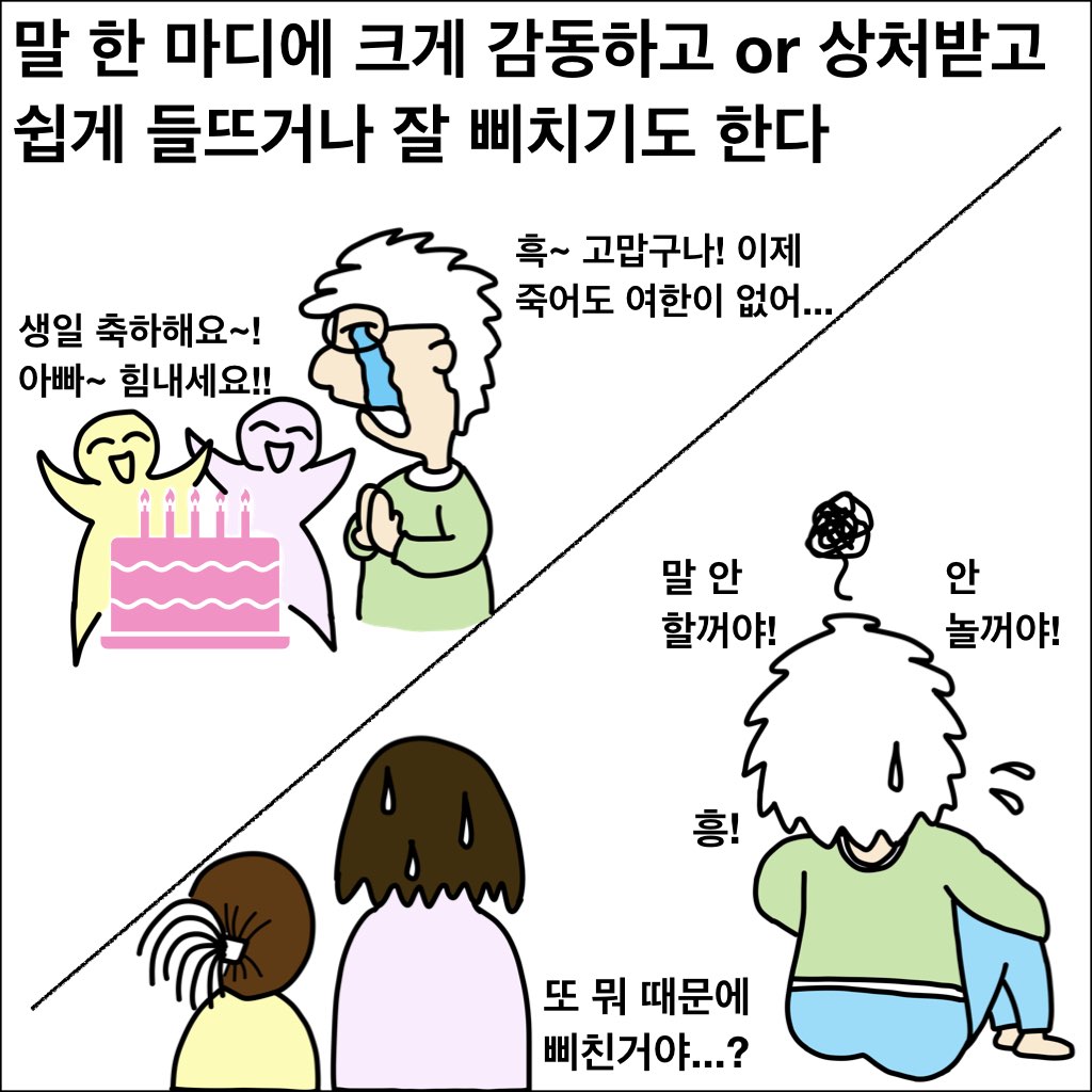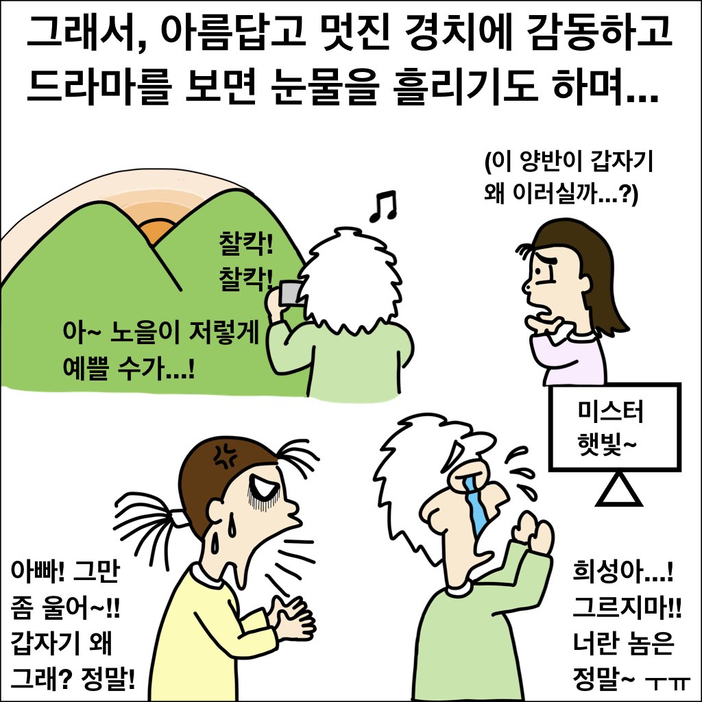 아직 중년이 아니라고 생각하는 나조차도 예전보다는 지금 감수성이 예민해진 것을 느낀다. 예전에는 눈물이라곤 흘려본 적이 없었는데, 최근 1~2년 전부터 우리 딸의 발표회를 보고 눈물을 글썽인 적도 있고 종종 감동적인 영화를 보고 코끝이 찡해진... 그런 놀라운 변화를 경험한 것이다. 이제 50대에 막 접어든 선배는 슬픈 드라마만 보면 그냥 자동적으로 눈물이 주르르 흐른다고 한다.
