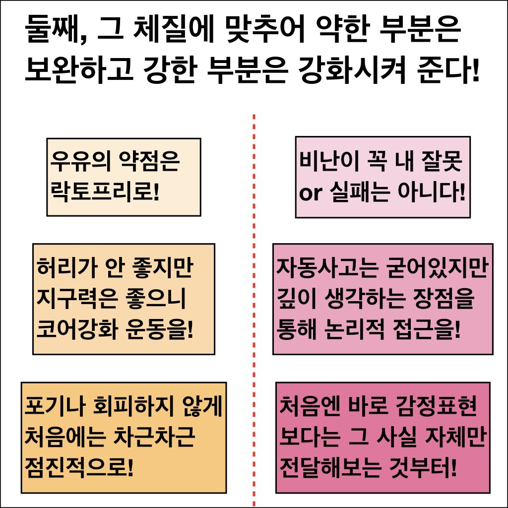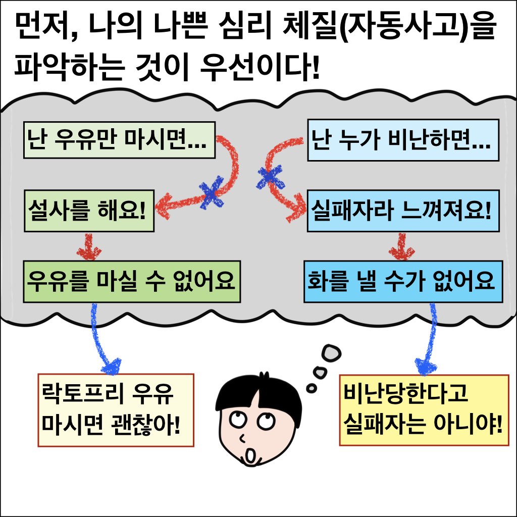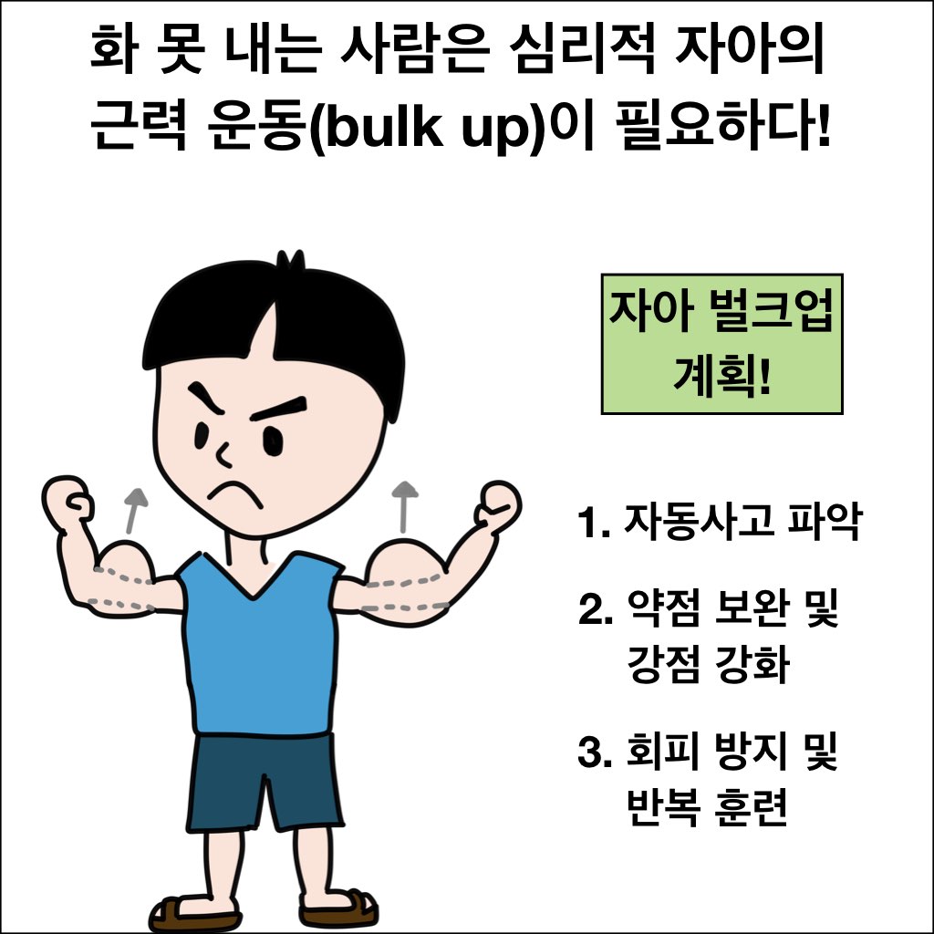 화를 못 내는 사람들은 흔히 마음속에 자동사고가 존재한다. 자동사고란, 마음속에 이미 뭔가를 떠올리기만 하면 자동적으로 결론 내려버리는 그런 고정관념 같은 것인데, 이것을 바로잡아주면 큰 도움이 된다. (물론, 자동사고는 화를 잘 내는 사람에게도 흔하지만...) 게다가, 이들은 그런 자동사고가 있음을 바로 직면시키면 회피하는 성향이 있기 때문에, 지지적인 접근방식으로 약점은 보완해주고 강점은 살리면서 점진적인 회복을 유도하는 것이 더 효과적이다. 이 과정은 근력운동처럼 아프기도 하고 맨날 똑같아서 지루하지만, 포기하지 않고 꾸준히만 할 수 있다면 실제로 정말 도움이 될 것으로 본다.